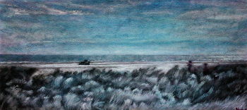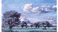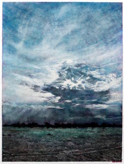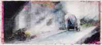 Sold (R1 400.00) | View detail>>Artist statement: I am interested in the dichotomy of man and machine and the affects of modernisation on society and the individual psyche. The inherent mechanical impersonality embodied in a machine made image, such as a film image, is subverted by its translation into painting, a human handmade process. Ironically, the technique employed imitates that of a modern printer in that I layer cyan, magenta, yellow and black (CMYK). This rather meticulous layering of colour in a scheme similar to that of a modern printer sets up a context of rigid mechanical impersonality, which can then be ripped apart and subverted from within by my innate human imperfection and a determined, if rather cautious, disregard for these rules. By incorporating images of local landscapes along with exotic film images this body of work becomes, for me, an investigative probation into the boundaries of my reality and my separation from it.