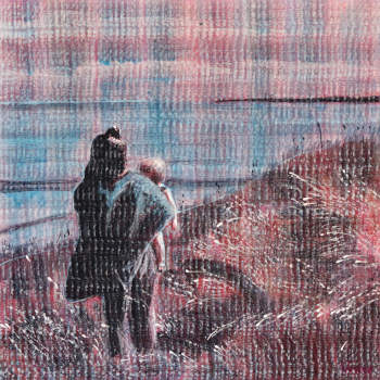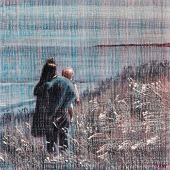Displayed side by side , panorama, long wide horizon , rolling hills, each valley contains a mother and child couple looking out toward the sea with their backs to the viewer, making the viewer a spectator, if i could see my reflection, what would I be? What would I look like? What would I be like? Good or evil? Disintegrated . Listening to rain, disintegrating into the rain, drifting, particles drifting , losing the center , the unity, where shall i place the border between me and not me, me and the outside, inside and outside, where is this border, where is this border on my body, where do i place myself in my body? Why do i recognise these patterns, are the pathways in my brain, dormant pathways, waiting to be activated, do i have the capacity to see things i now don’t see? How do i activate those pathways, how do i draw to the surface the thoughts undetermined from the pool of the unconscious, how do i draw them to the surface, make them rise out , and become determined , you expand me inwardly so that i can see so that i am able to see, i am blind , you expand me inwardly so that i can understand , beyond understanding, i can rise above myself, i can lose the center , i can have vision beyond the center the unity the point of view, what would the be like like, beyond sight , no sight no feeling . Waves , moving up and down on waves, slow large waves, primordial waves, proto thoughts, being water. Ignorance sadness stumbling on in a world beyond anyones capbility to understand to know what good or bad or real, going on blindly stumbly with dim sight what lied ahead of what is wanted expected the weight of what is expected the burden of expactation what do you want me to do? Does everyone need to read a hundred books on postmodernism religion history ? Analysis om socoety and the world and God. And you. Do i see you ? Are you subtending us. Robots in a post human world, lookinglike humans, thinking like humans , not creatures of God. Creatures of man.
