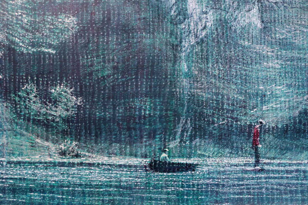 One day I went for a walk on the mountain of speculation and metaphor, and this is what I saw. There is a point beyond my senses, a ‘mouth’ of creation, as it were, that falls out of time and space. And from it proceeds the things that are knit into my reality. At that point, that unseen point, all my thought proceeds, and the matter of my universe. And with my thought ensues my mind. How do my thoughts come about? How is my mind created? I wondered. In these paintings, the two figures journey on, into their futures, their contingent ephemeral futures, being knit or spoken into reality, into their minds, and into time and space, at their unseen mouths of creation. God contains all the possibilities, even the evil ones, He thought them all already, nothing is conceivable or possible, no thought can travel through the mind, unless He has thought it already. (Always already). Each unseen mouth can speak or knit different possibilities into reality. Then my mouth, my mind, my future, my reality, is a medium for God’s possibilities. I fear missing, or missing out on, some thought for my mind, or some possibility for my future, for the Lord will not force the unwilling.