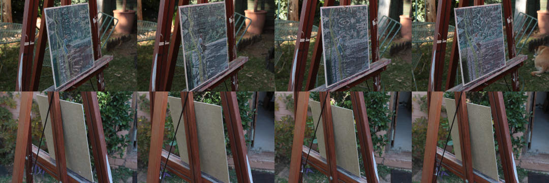 The focal point could be her face. Comparing the different expressions in the four repetitions, reveals something of the motions within her. She seems to have a weighty purpose, something sublime, or terrible even, as if she is not just human, but something more. But then again, she is not human, she is a representation, a painted figure, doing what painted figures do, in their universe of the artwork.