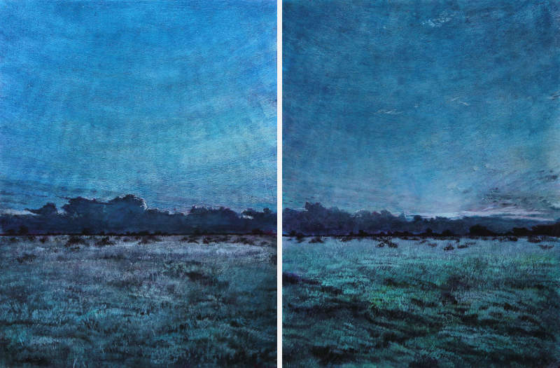 When I contemplate these paintings I think of two rough boys that have been dressed up in suits, their mother has wiped their noses and told them to behave. There is comedy, as they strain to compose themselves, and to conform. They have been asked to fall deeper into the world of society, and asked to further abandon their own worlds, where the only rule is their rule. I find it sublime to project these landscapes as personalities, perhaps even projecting personalities I know, where instead of seeing their bodies, their faces, their eyes, I would be presented only with these vast expanses of wilderness. It would be sublime because they contain something so profoundly untamable, and a force that would be so far beyond my capability to control.