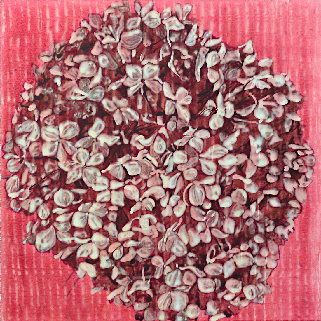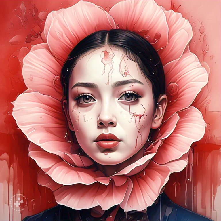 17 February 2024 Plastic. Presenting a front. Rose coloured. Pretty petals. The vertical pattern seems to slice this flower in half. A horrible alien grimacing, blowing me a kiss. A weird creature, full of eyes. The fairy that lives in this flower? Now it sleeps. Now she sleeps. No, i will not reject her, even though she seems weird to me; to my aesthetic. Playfulness, sadness, beseeching. Will you love me? I see me in these red hues; my gaze, my look. I see the magical effect of movement within no movement. My child, my gaze, looking back at me. So strange, so terrible, yet so fascinating. Climbing into worlds I would never have thought of before now. Its like reading a novel with no words. I love art. I love contemplating art. A flower is a plant’s sexual organ. Why do these flowers have five petals? The paint holds the trace of water. New pathways have been formed in my mind.