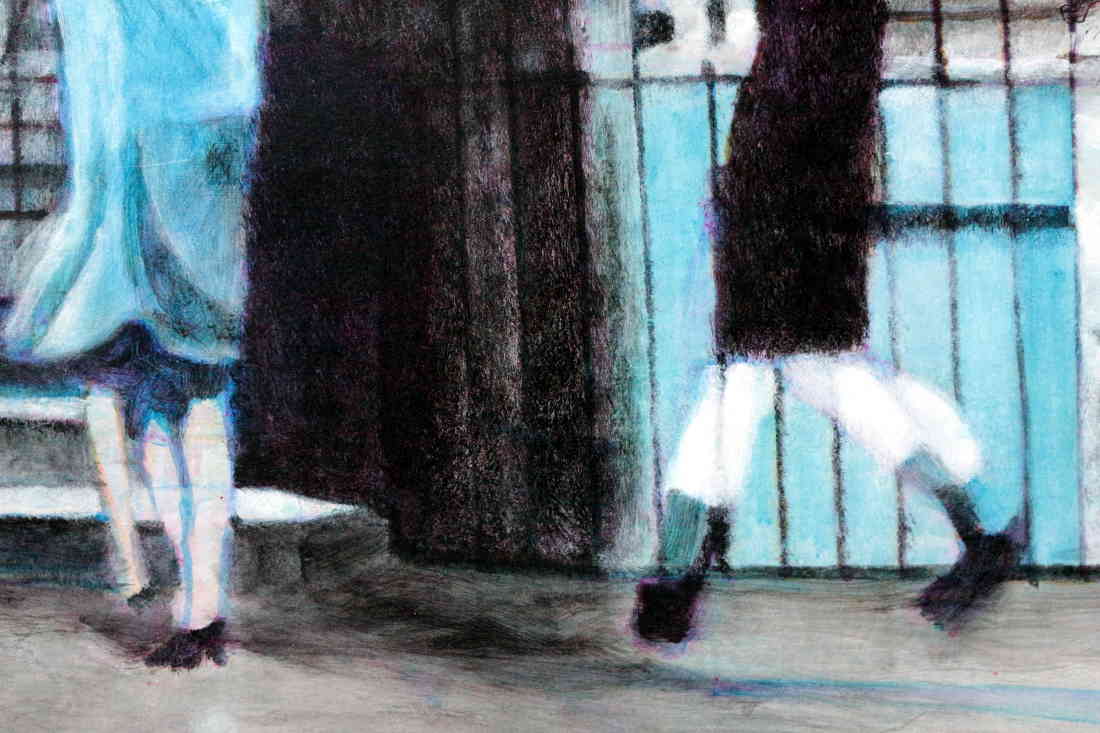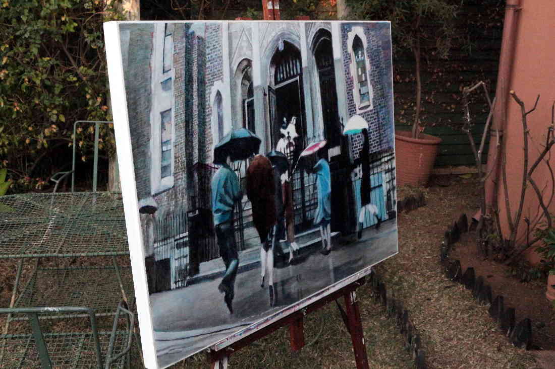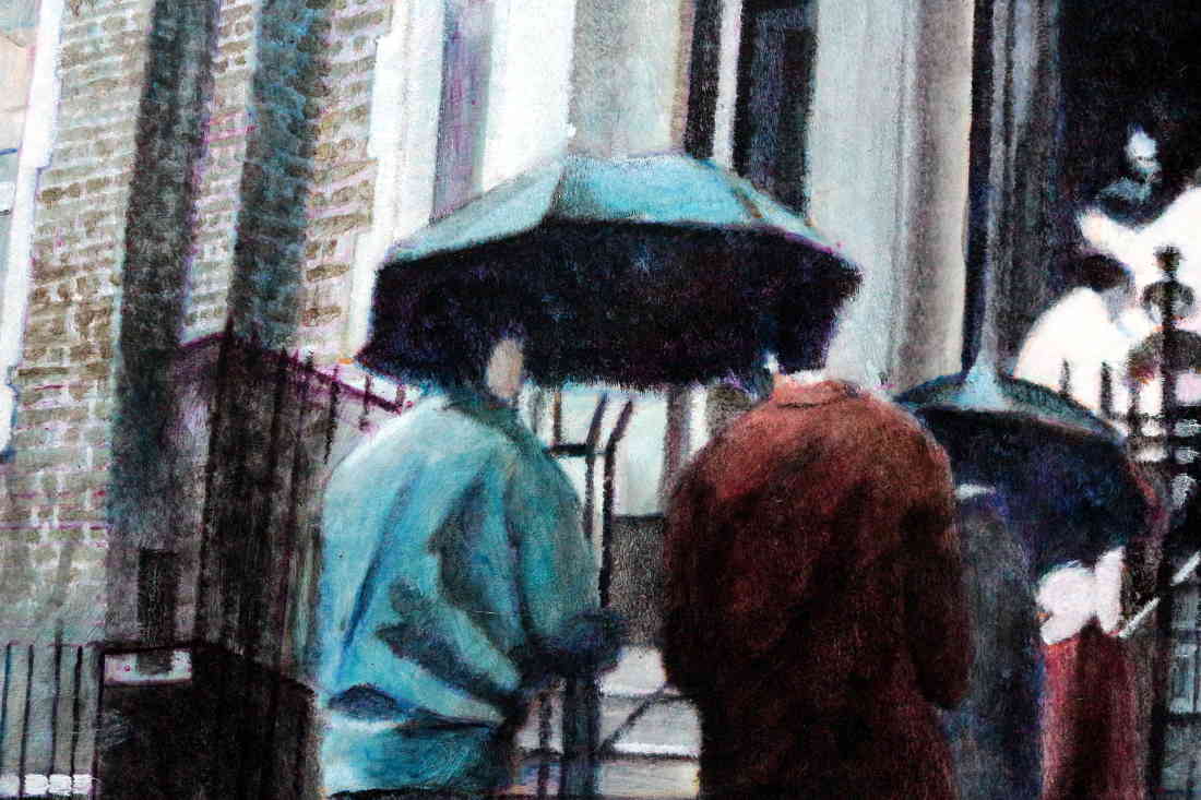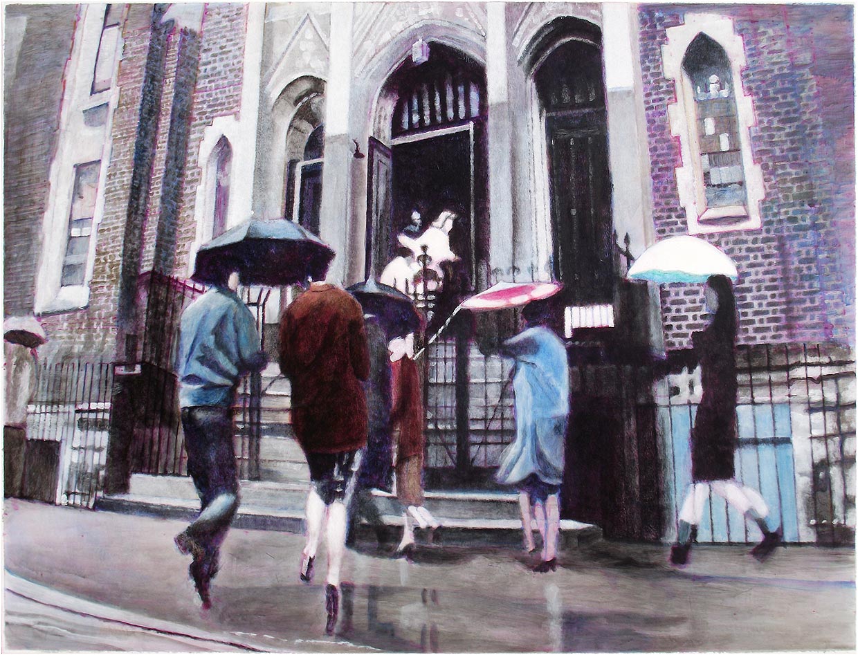 It's raining and people are running for shelter. The threshold at the top of the stairs indicates a transition from one reality to another. Perhaps from this temporary reality to the eternal afterlife. Or perhaps we could see it as Dante's Mount Purgatory. Some people seem to be stumbling over what appears to be a third leg, while others seem to be sailing swiftly along. Or are they, on closer inspection, slipping on the wet surface? And some have made it, as it were, they have completed their trials and are being let in.