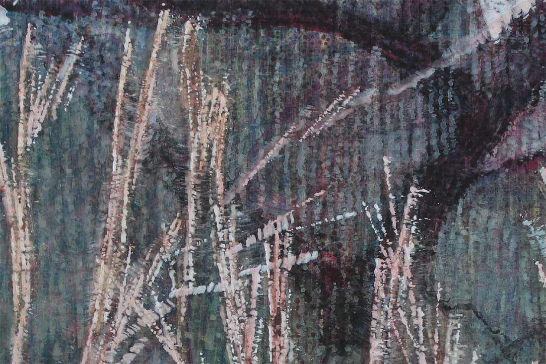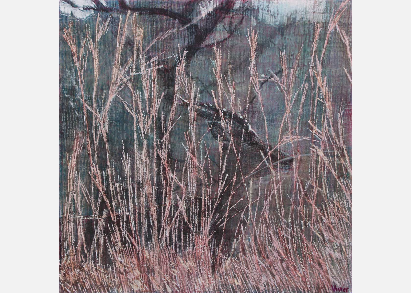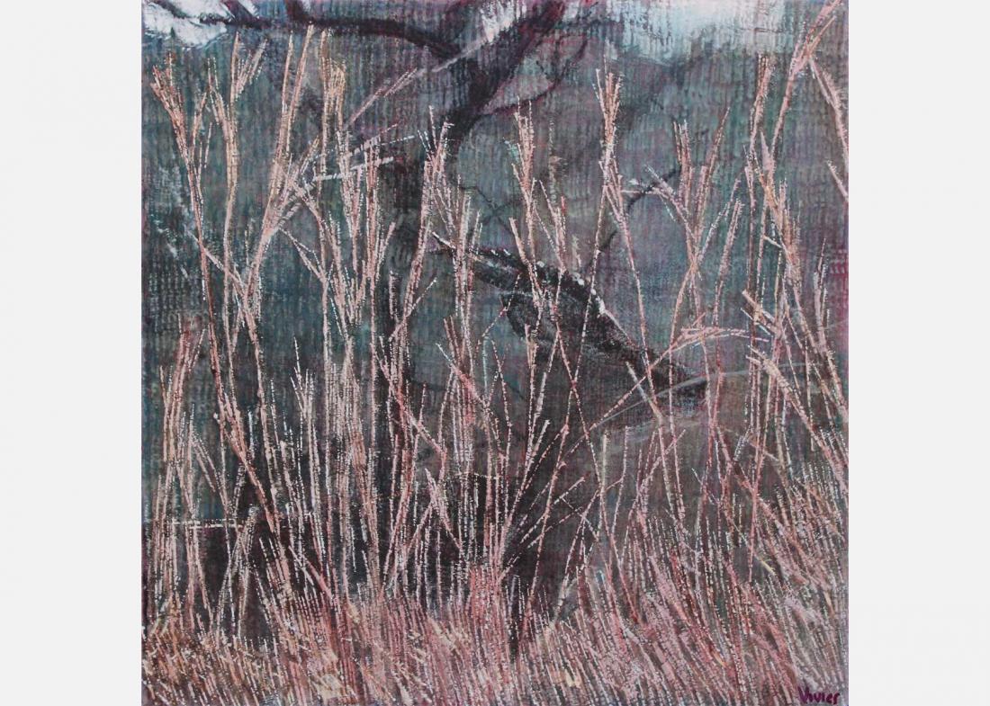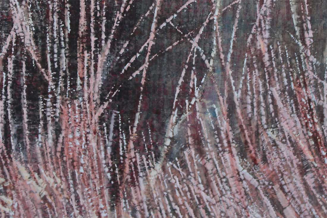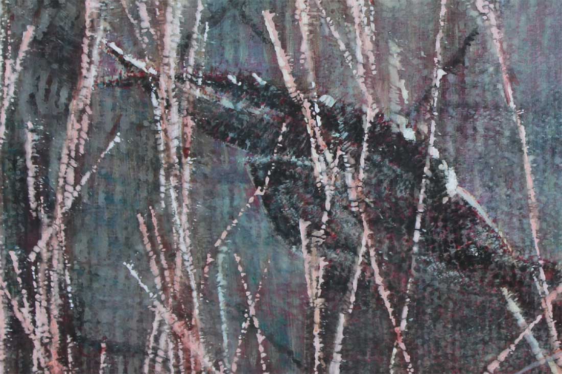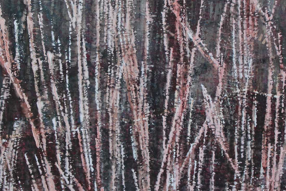 God often speaks to us in a whisper, a small quiet voice, but we seldom are able to hear it because of the layer upon layer of spectacle that separates us from reality. This spectacle is suggested by the bright hyperreal grass forming a kind of barrier that obscures the scene behind it. Our perceptions are mediated and our access to the absolute truth is never perfect, always influenced by our preconceived ideas. The entire surface, including the obscured scene behind the grass, has been rendered in a rough pixellated way, which disturbs the smooth veneer of perceived ’reality’ and questions the veracity of everything seen.