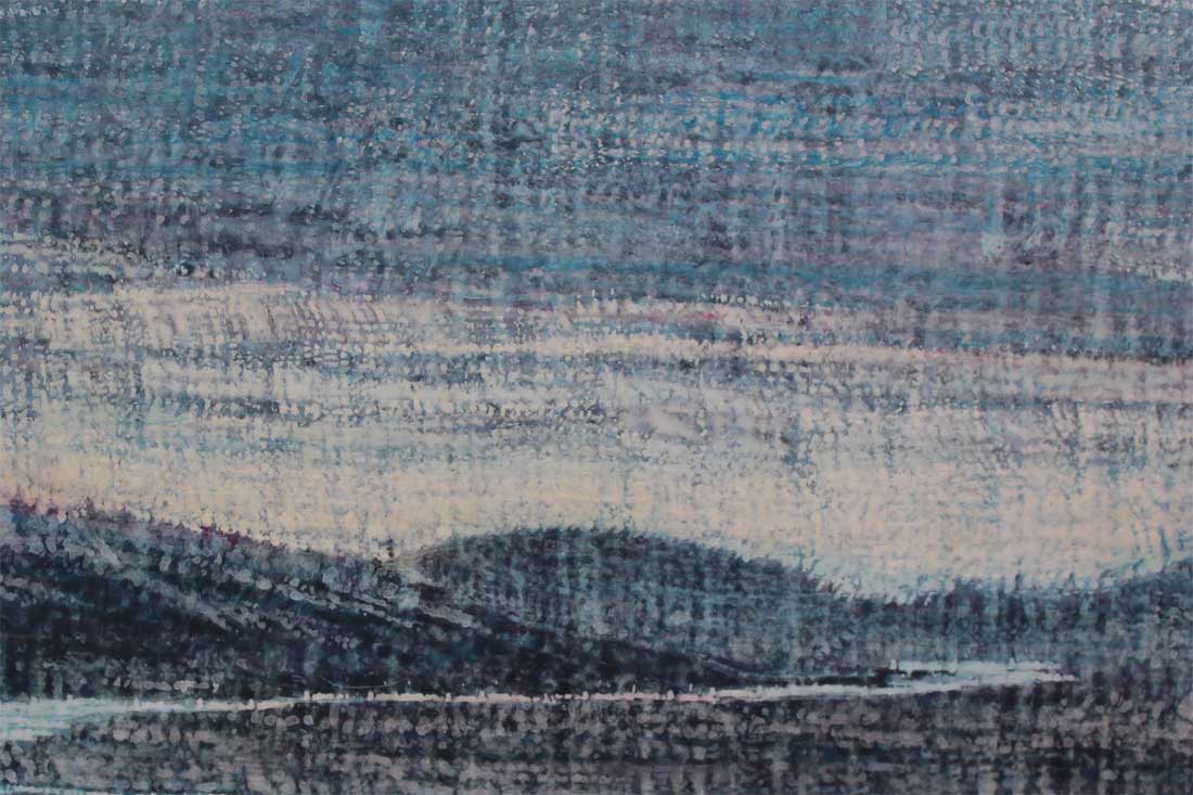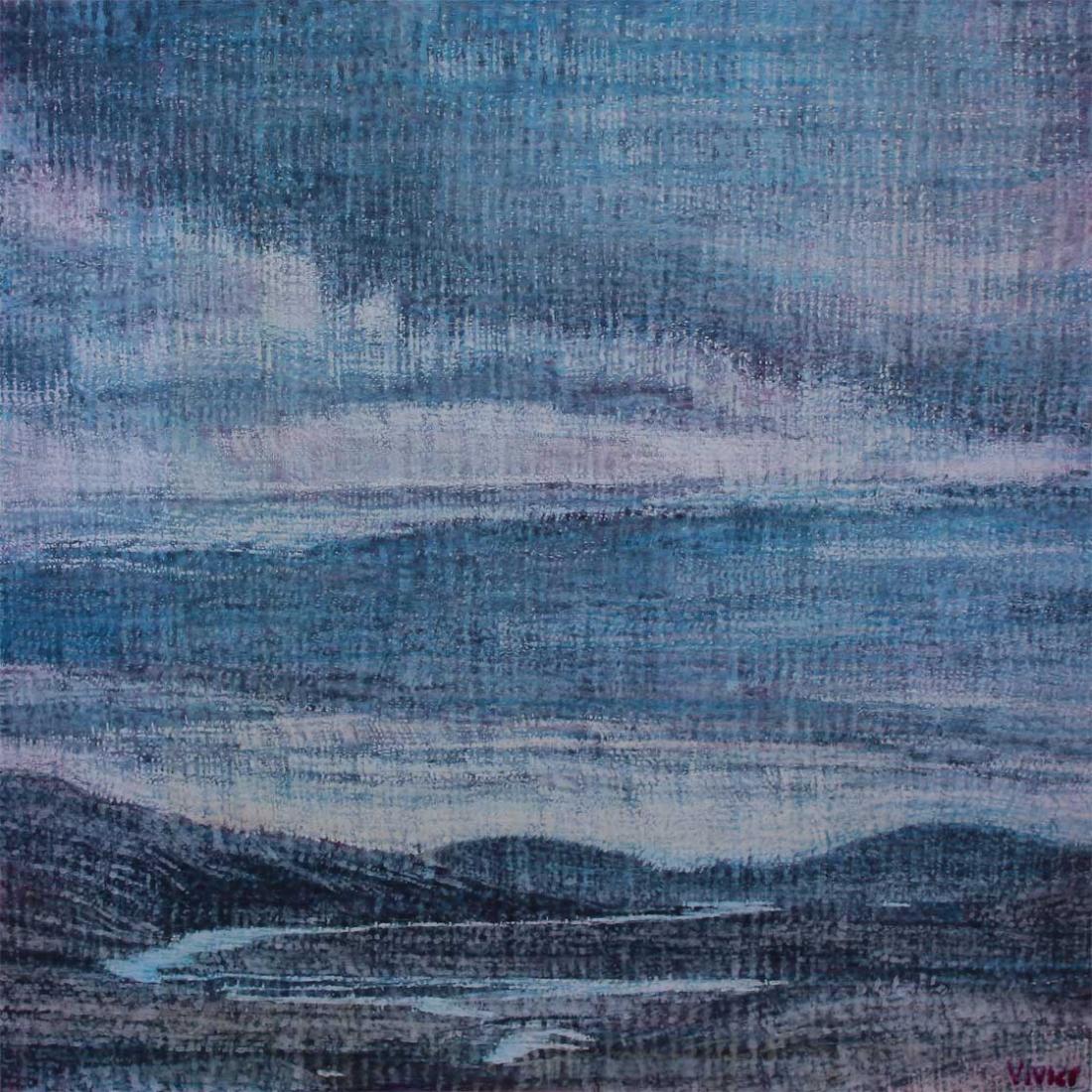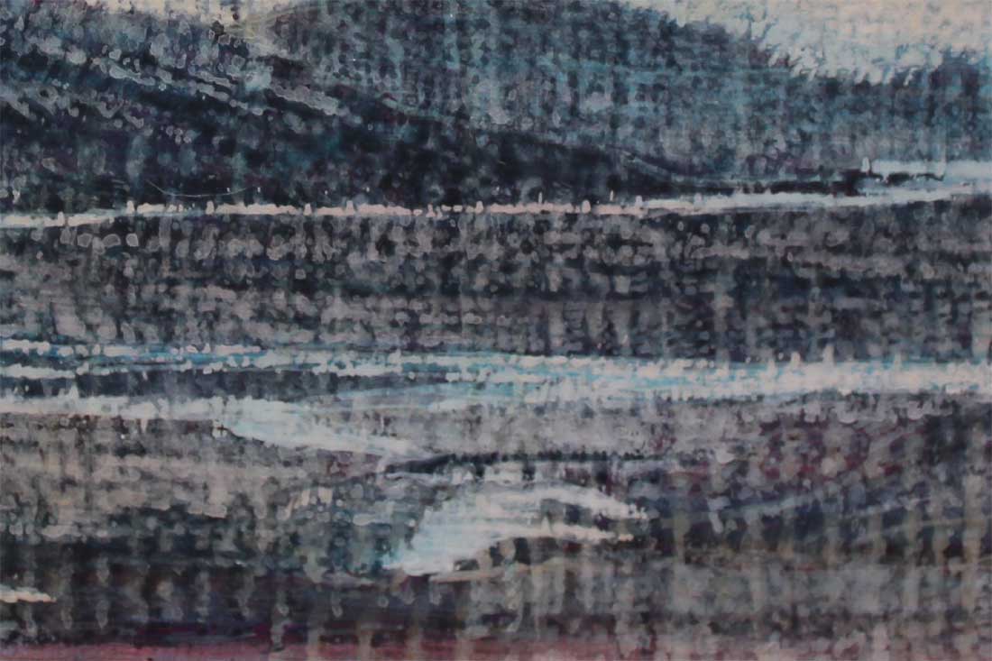 This painting seems saturated and heavy with water. Its predominantly blue colour, the clouds apparently pregnant with rain and the wide river winding through the hills would all enforce the experience or contemplation of this natural element. Also, the pixellated surface through which the landscape is viewed can also seem like a window dripping with rain. There is a modern construction over the river, making entry into the water avoidable and the landscape is surprisingly barren despite the abundance of water. If the water is a metaphor for the spiritual, then it would suggest a modern world at odds with itself and religiously frustrated.