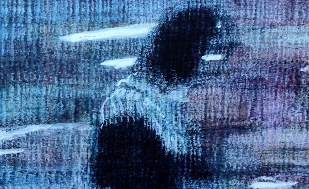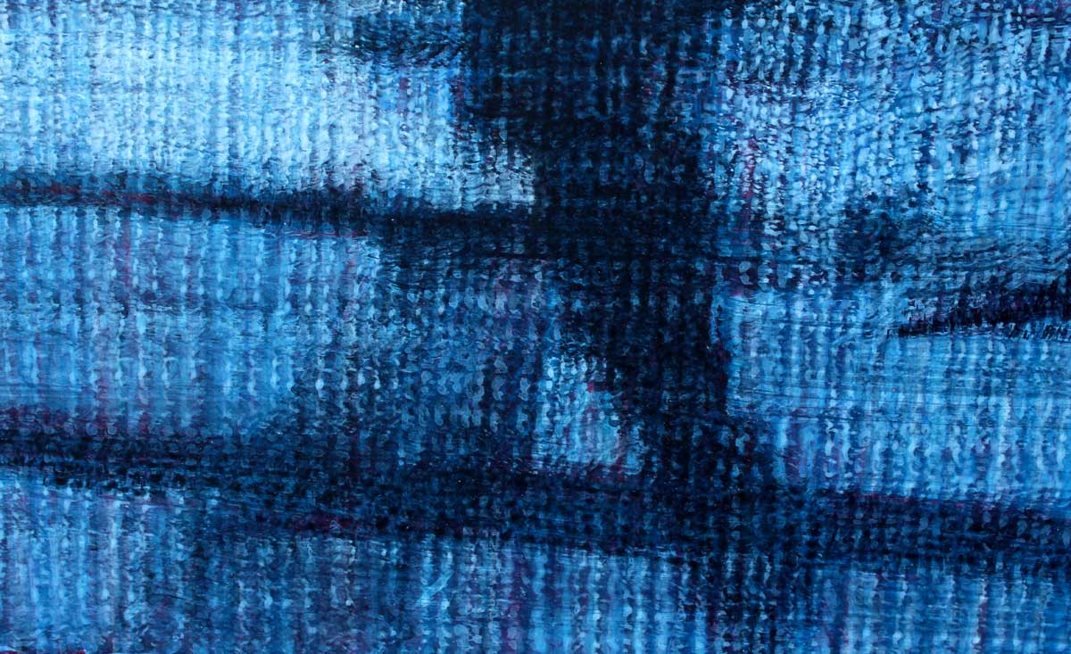 An indistinct figure walks through a patterned surface. The pattern is characterised by vertical lines which create a certain vibration and rhythm. It also seems to suggest digital pixellation, but because it is executed by an ’imperfect’ human hand, there are areas where the rigid pattern is disrupted. The background setting wavers between a blurred urban setting and a fantastical beach at sunset on an otherworldly planet. This painting’s boundaries of time and space are destabalised as new patterns emerge.