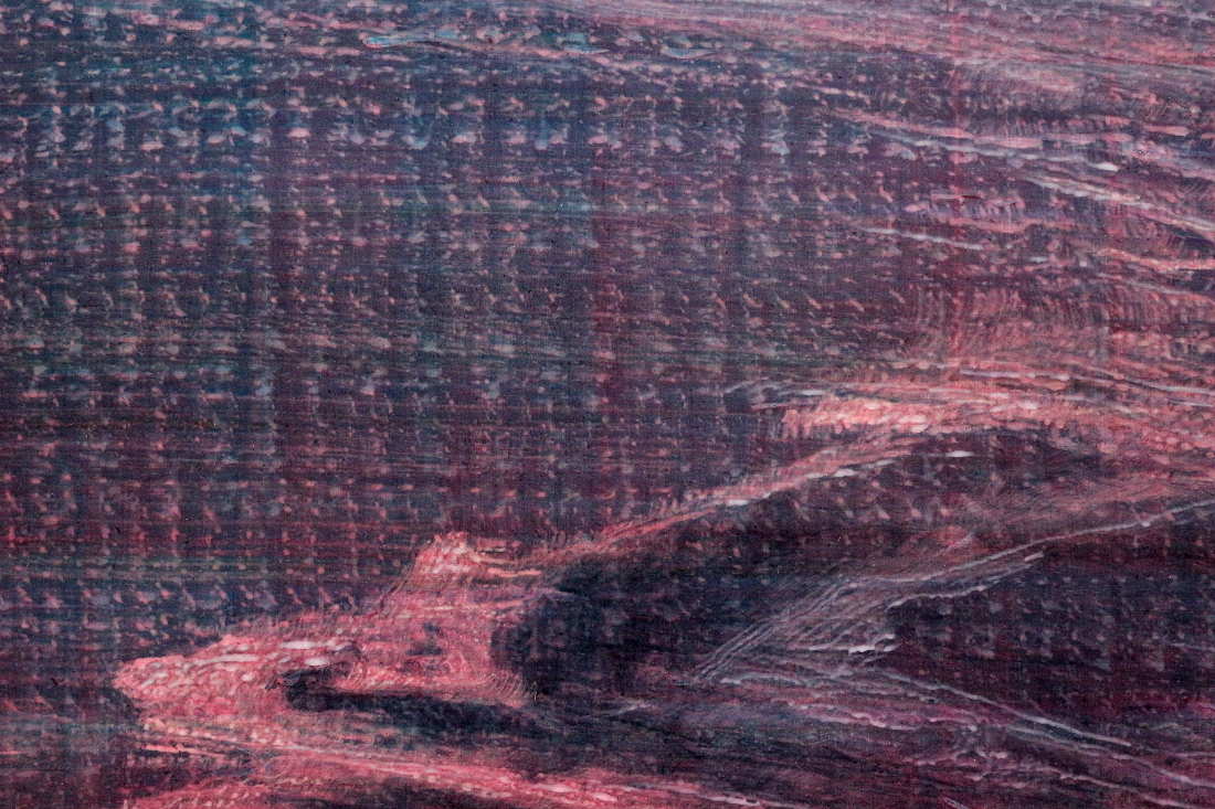 In the therapeutic ripples of this allegorical vision I see what appears to be two celestial beings acting out their sublime narrative. The loose weave of the surface is breaking apart, giving a glimpse of the 'reality' that lies behind. At a distance far away on the horizon is a hazy dragon-like cloud formation, which appears to have two faces. The first face seems brash and hot-blooded, while the second face seems older, calmer and wiser. He has just absorbed a stinging blow from the creature above, her tail-sting still red from the aggressive assault. The staggered brush strokes seem to create small shimmering waves in the ’depths’ behind the surface giving slight animation to the she-beast in the sky. But her assault is salutary because it causes him to grow from the brash youth into fruitful maturity.