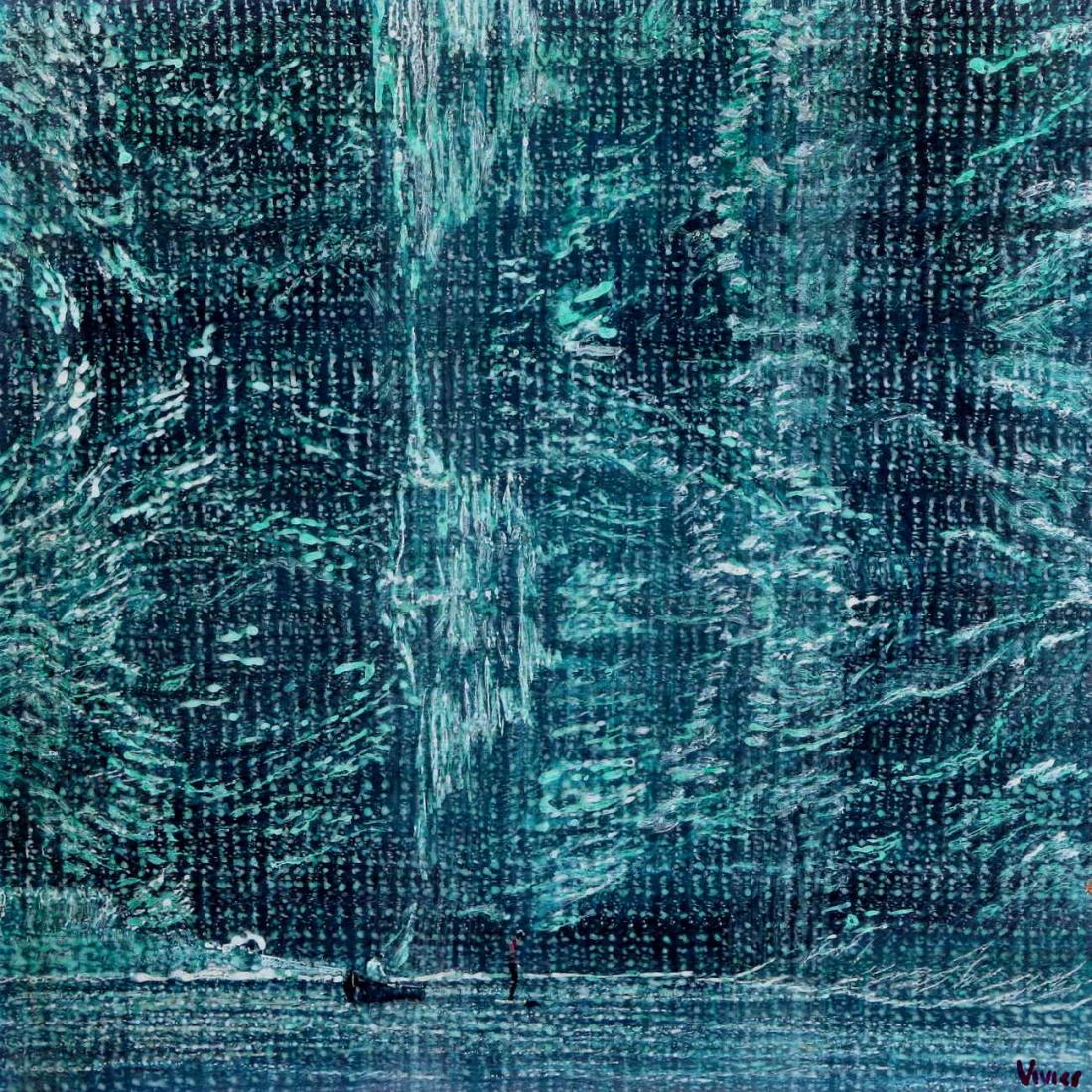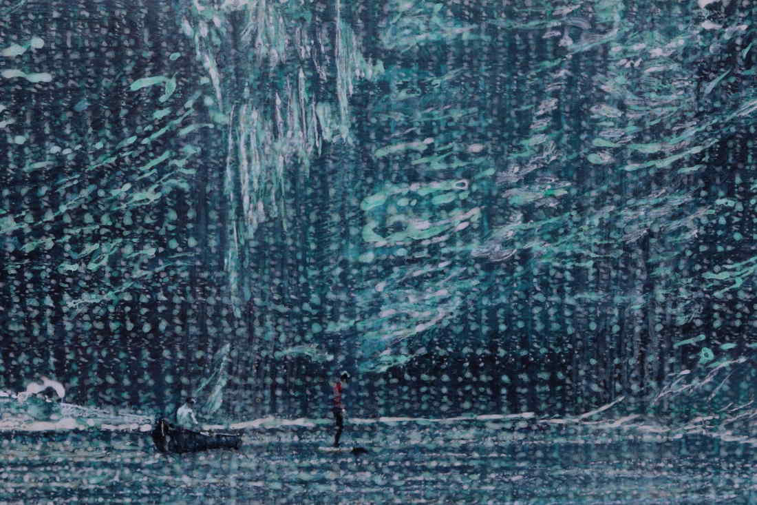 I see anger in the disruptive static, which lies in tension with the calm tranquility of the colour, form and content. I see a modern brutalism in tension with the real rhythms of life and the universe. I also see a kind of celestial map of destiny for the two figures on the river in the simulacral patterns that tower above them. Does the recognition of terror by intuition suggest something real?