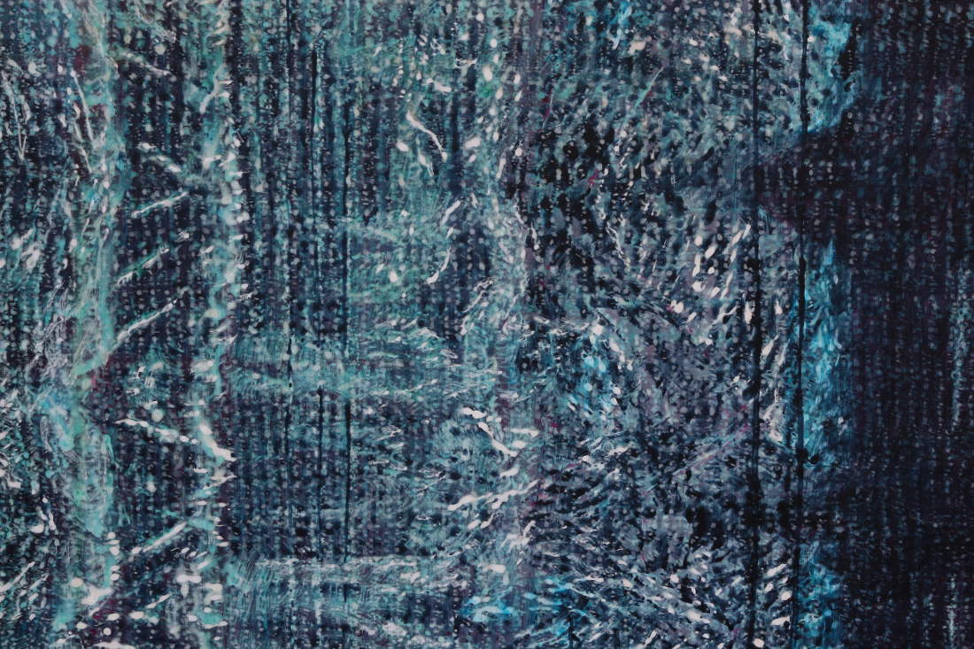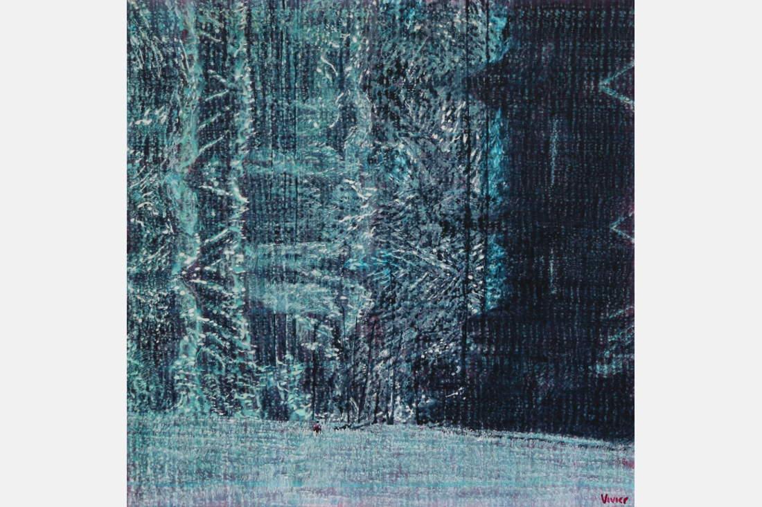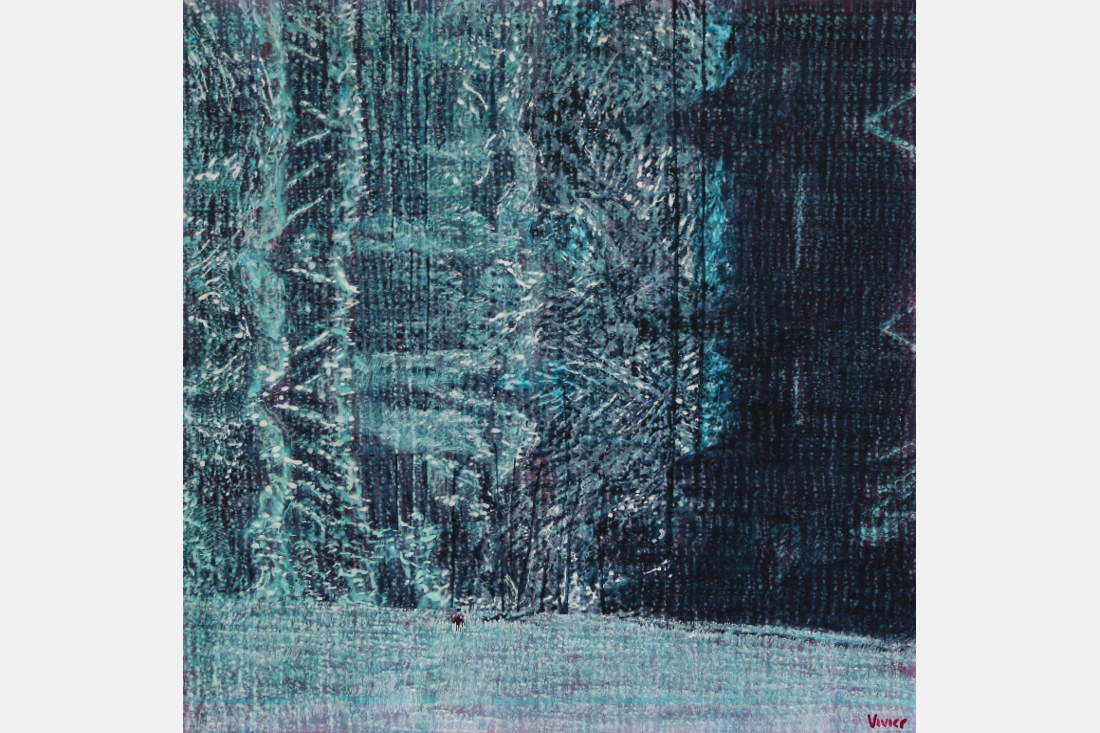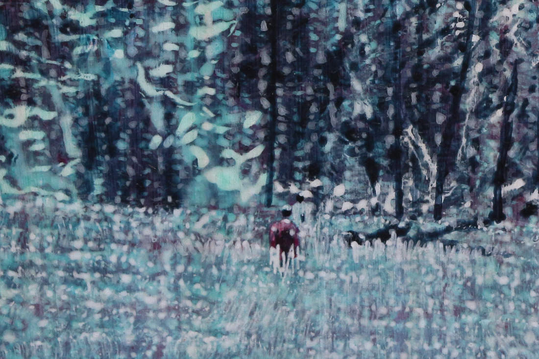 At the feet of a sacred wood, two figures in a field of grass are performing a dance, where they are required to measure their movements. In this process, they are learning new rhythms, which may look and feel awkward to them. The impossible tallness and impenetrability of the wood, with its flame-like vegetation, would suggest that it is an impasse for them. They are undergoing a transformation that will prepare them and enable them to continue their journey into the wood.