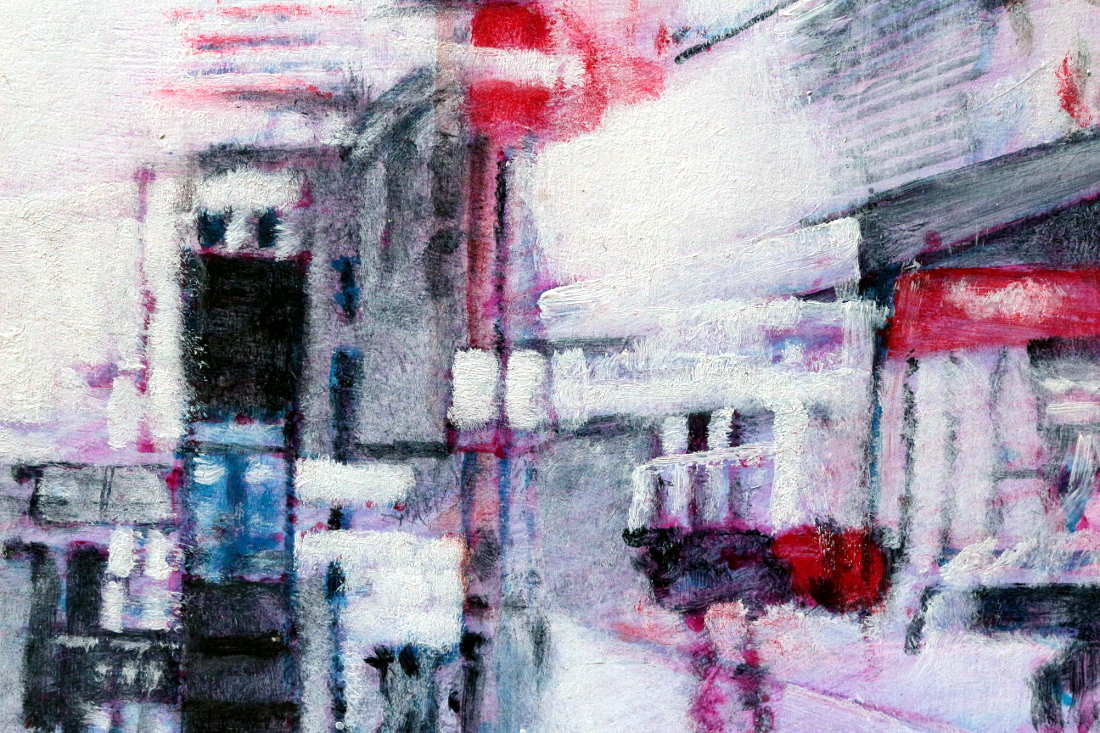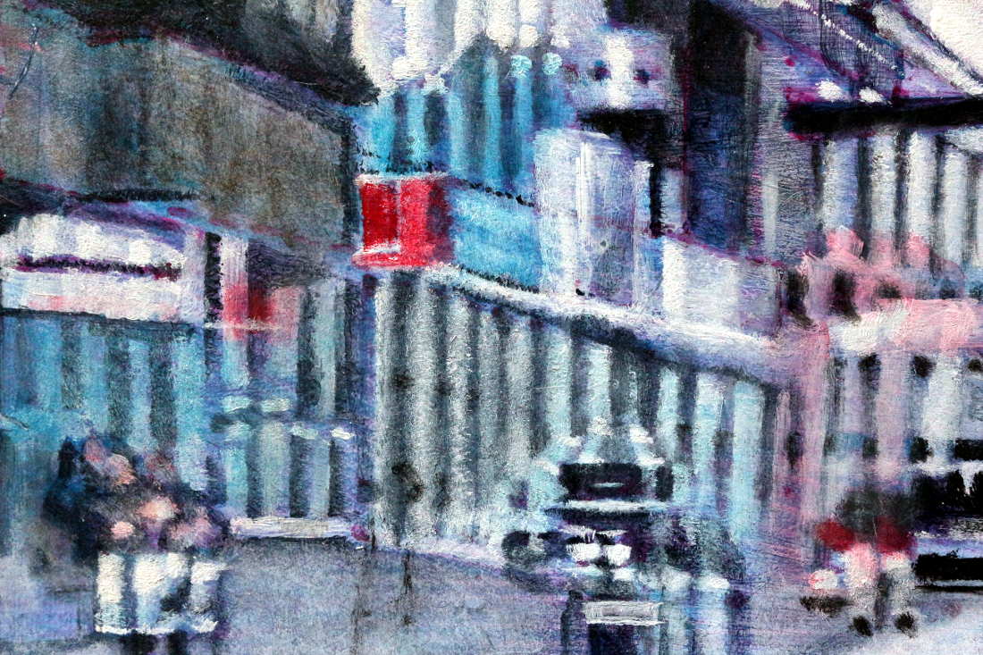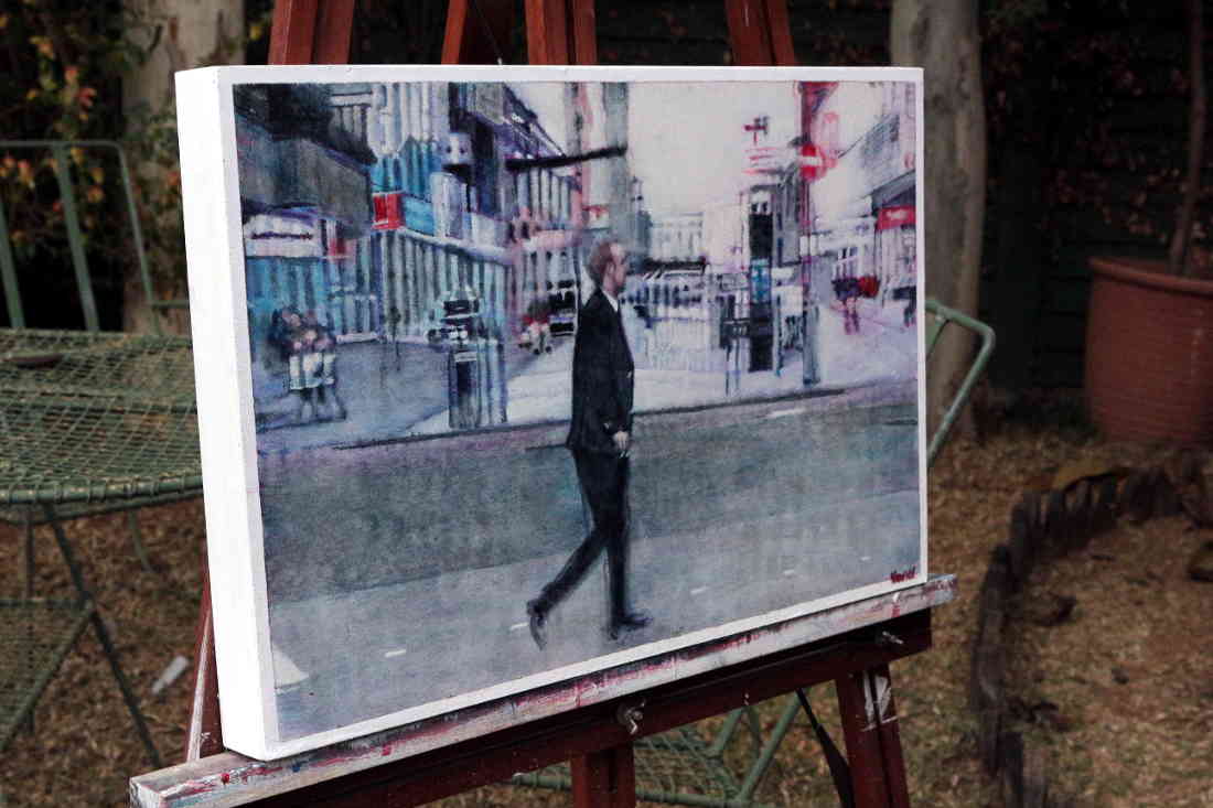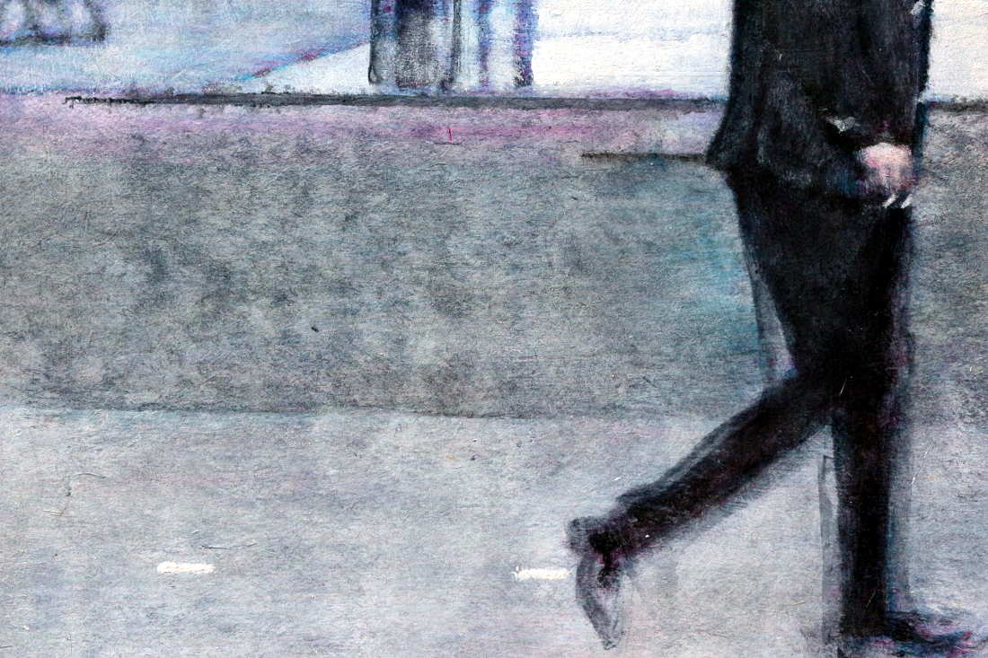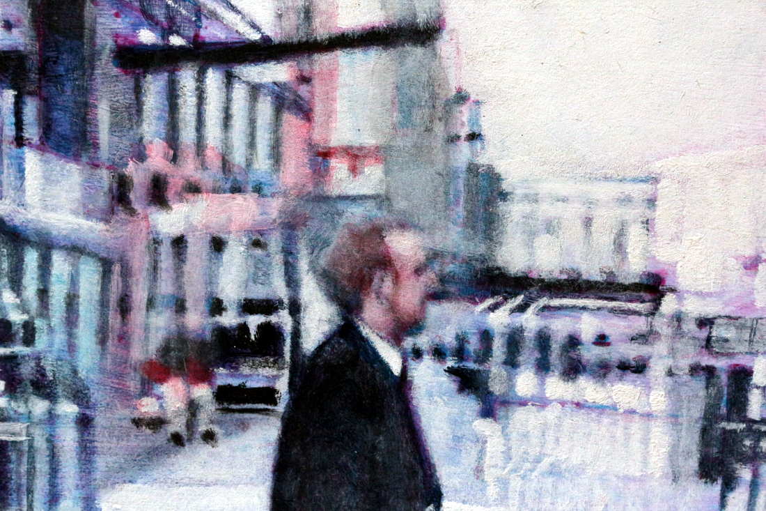 In this urban landscape a young man on a journey makes his way accross the grey asphalt. He is walking downhill and from left to right, suggesting that he is ’going with the flow’ for now. His legs however are not well defined and blurred, indicating uncertainty creeping into his easy going demeanour. At this point, he still mostly retains his integrity, unlike the the figures and objects in the background which have transformed into strange objects consisting out of more exaggerated blurs and repetitions of themselves. The living figures are almost indistinguishable from the inanimate objects and have become inextricably intertwined with their environment. The resulting shapes and forms are haunting and spiritually charged, sometimes suggesting ghosts or otherworldly creatures, or sometimes suggesting totem poles.