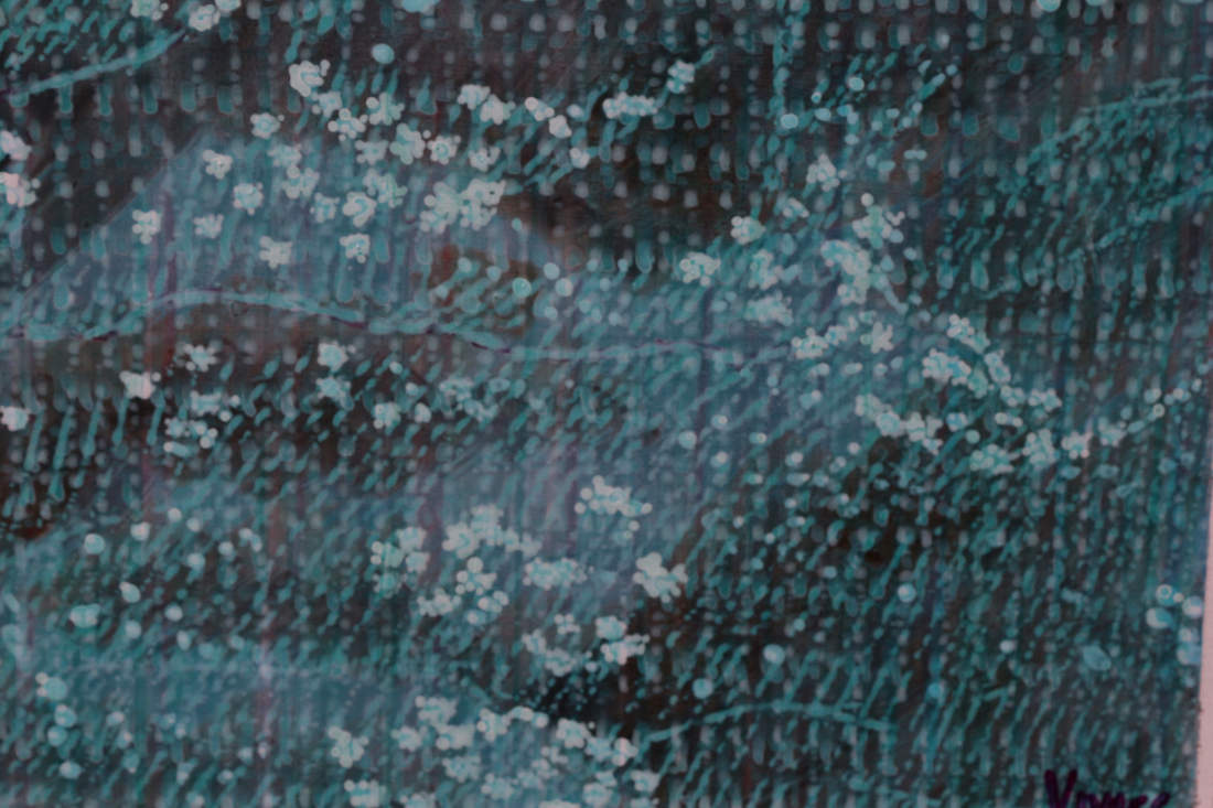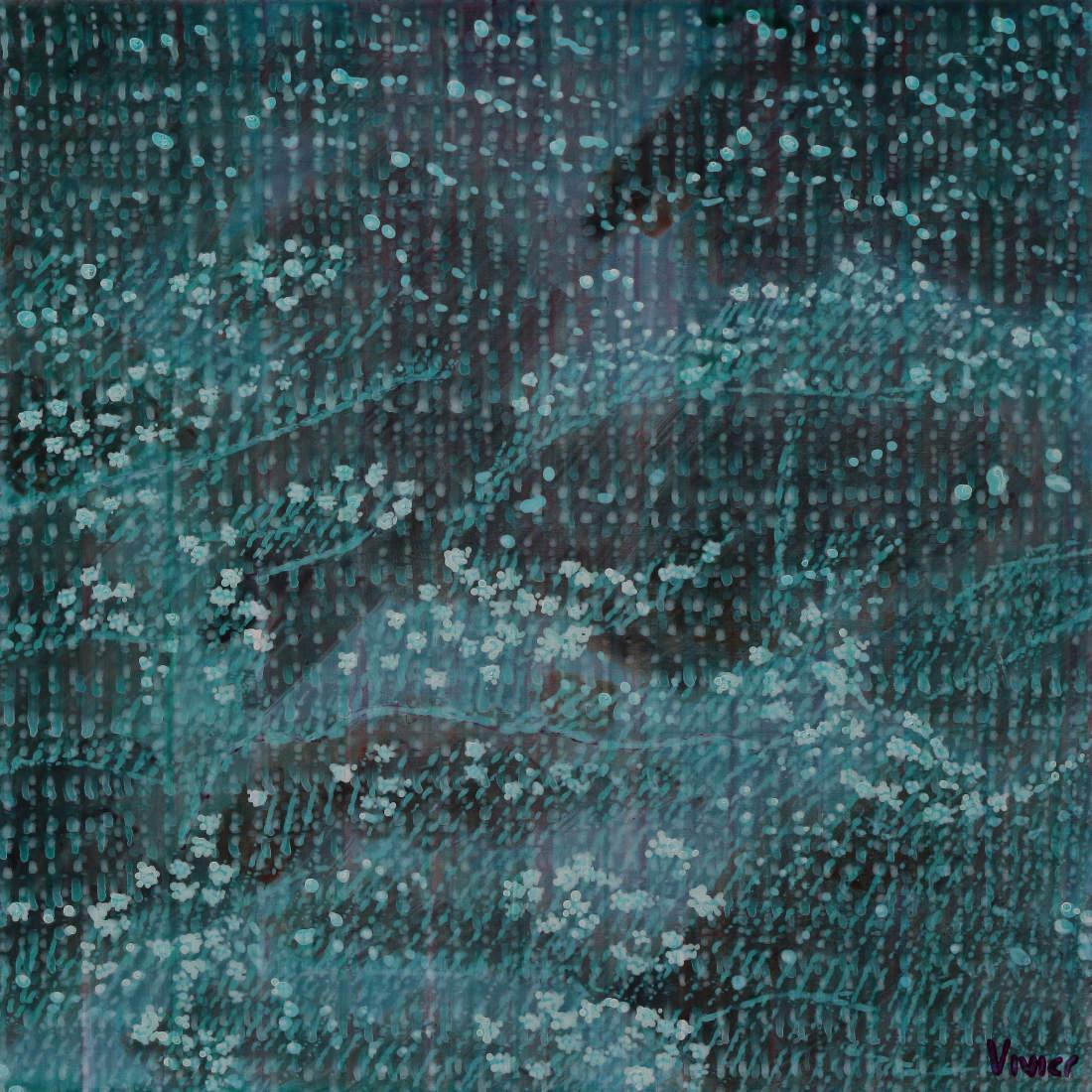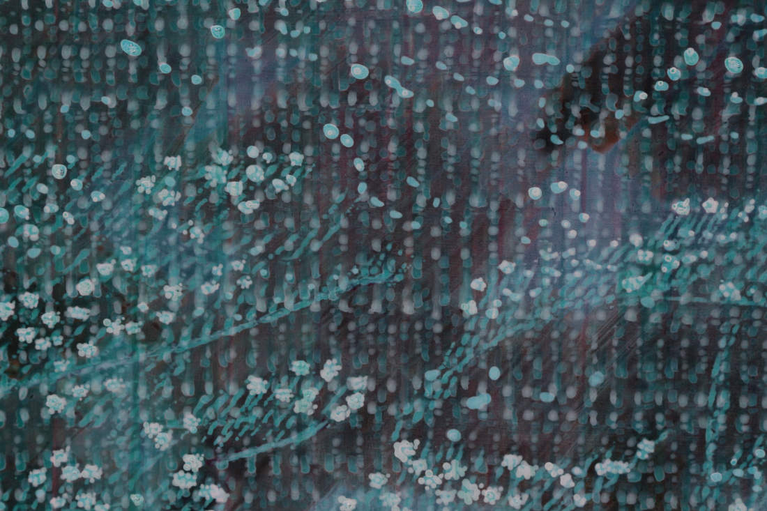A drop of water falling from the sky, hits a flower. The flower winces. The stalk bends. The raindrop deforms and wraps itself around the flower. The flower loses a petal or two. The raindrop divides into smaller drops that splatter outward in all directions. The raindrop transforms into splatter, the full moment of its glory, of its impact. The raindrop disintegrates, spends itself, spends its force. Some of it runs gently down, now caressing the stalk, some of it falls down to the ground, where it makes another strike, less potent this time. The flower rises again as the stalk recovers. It oscillates up and down, then hovers, and glistens with water beads, as if it were now wearing jewellery.