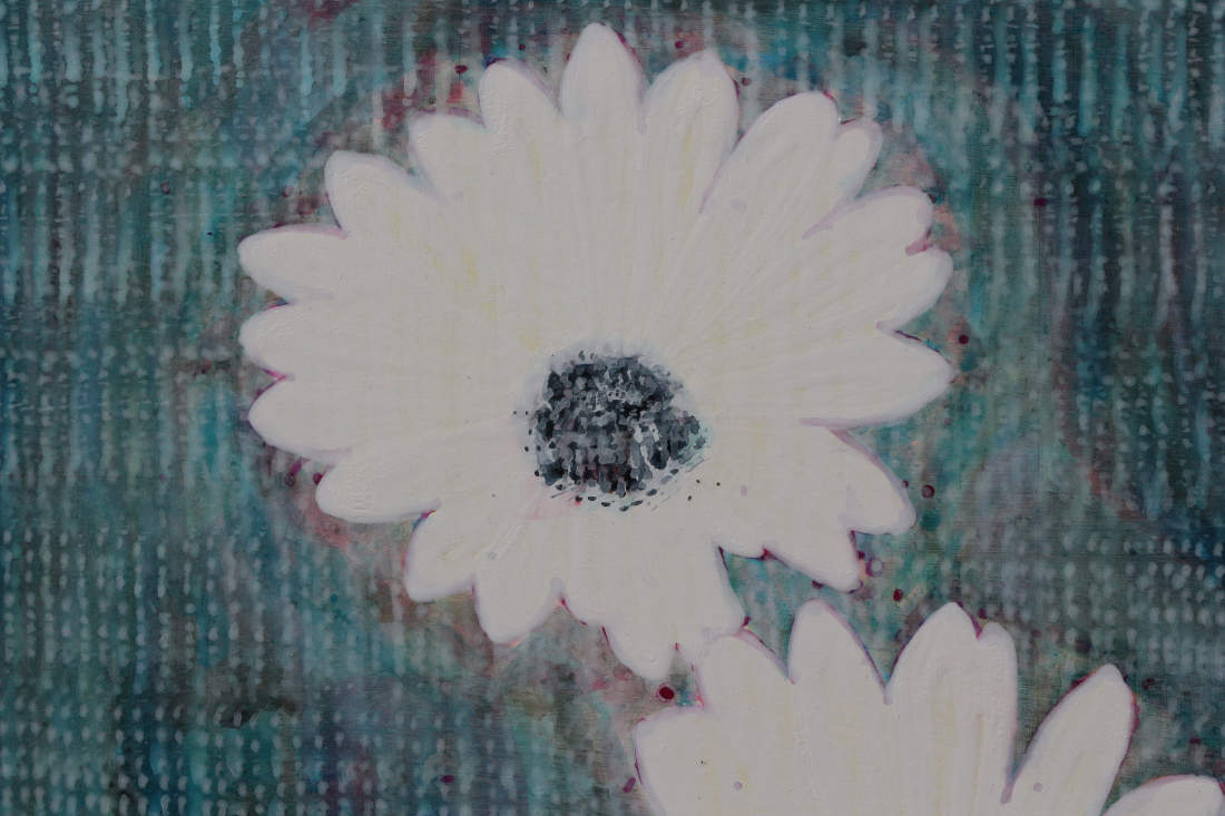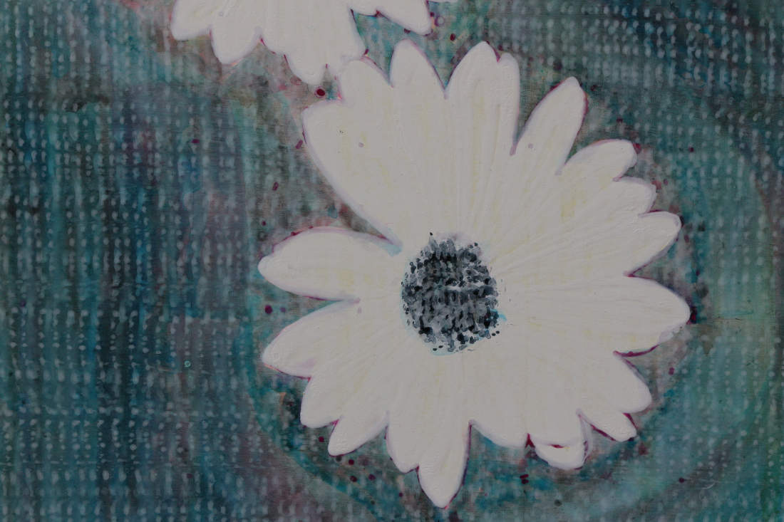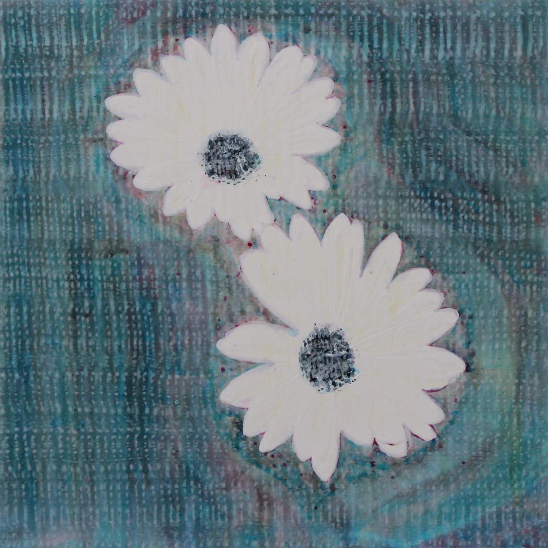 This is my fourth repetition of this image. Two painted flowers float on water. They must be basking in a bright hot sun, reflected in the petals. The coruscating water moves around them, as they move, rhythmically, up and down, making waves, rippling out, to mingle with the other waves. The movers move, causing waves, that interact with the waves of other movers. Ennui inhabit their dark centres, that form enquiring eyes filled with tears and sadness, and fallen imperfection. They solicit each other for something good, for a righteous path, that would allow this pair of sad weary souls a righteous desire.