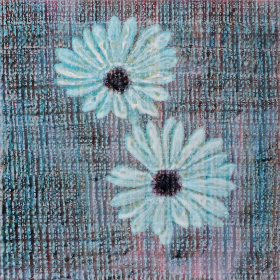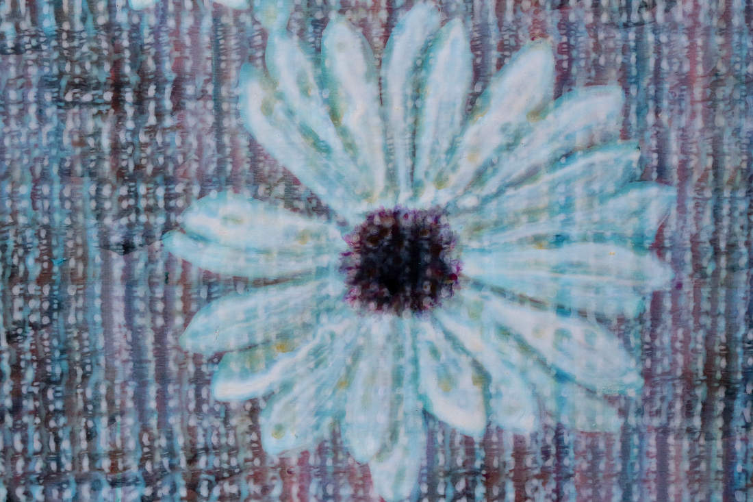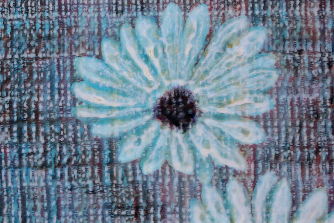Strange flowers from another nature, a different nature to this common one. Are they a presentation of the imagination? This painting snows and flickers, questioning its authenticity, its appearance is like a digital screen. There is a sense of loss of the real, the real replaced with the image on a digital screen, evoking the sadness inherent in that.