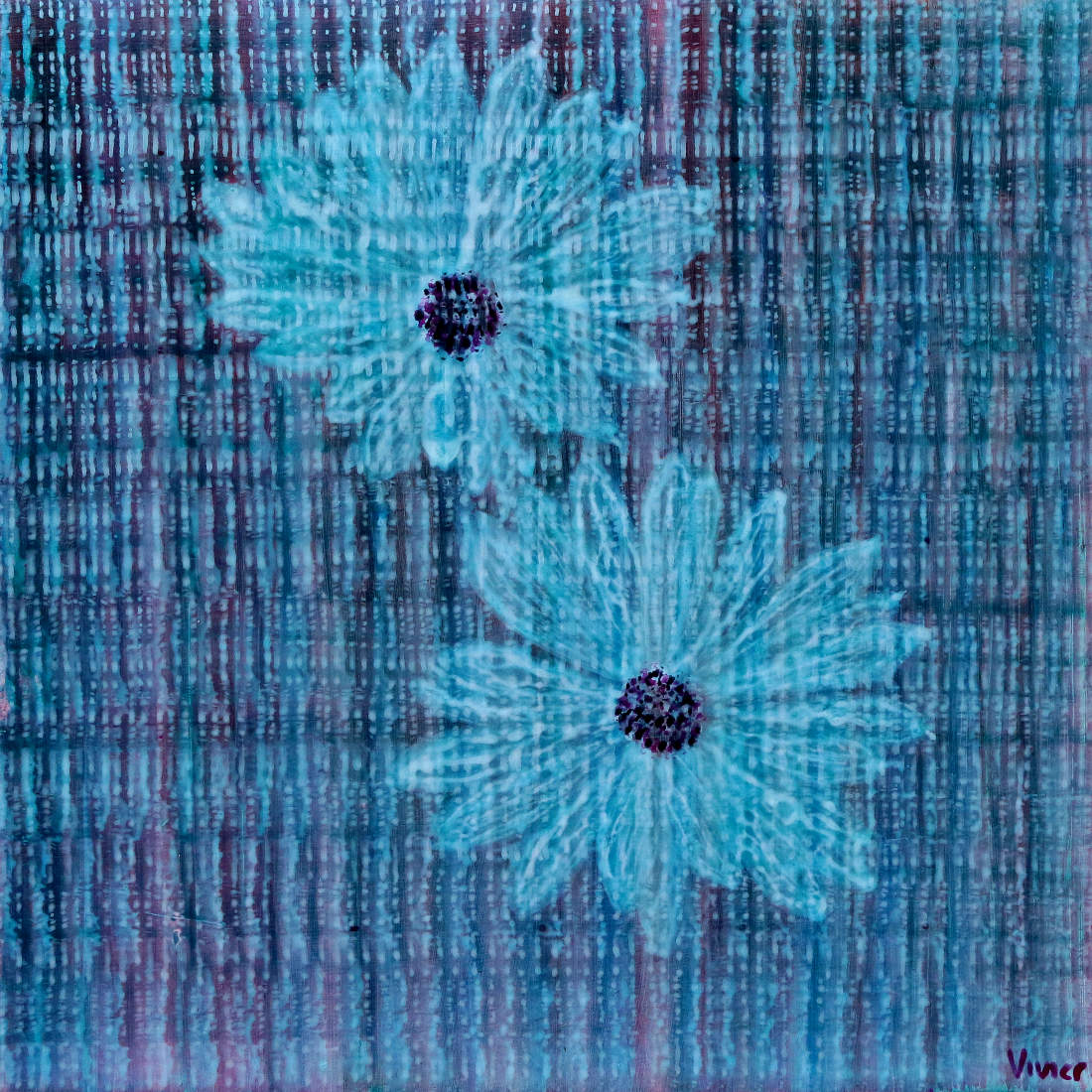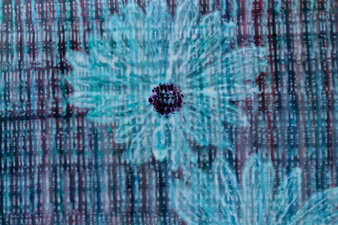 It impresses upon me that the flowers in this painting are flying forwards, with the background passing by, seemingly, as vertical stripes. The flowers are inured in an atmosphere, travelling through the air, the wind, the storm, the inclement weather. What savage bloom, under your inclement weather, could prosper? And that is how I feel about us sometimes. We are all savage blooms, beautiful sublime savage blooms, crushed, awkwardly stretched, but not destroyed.