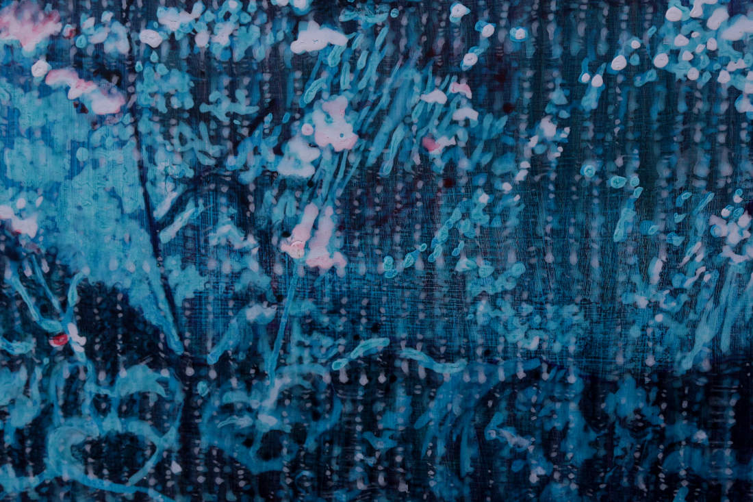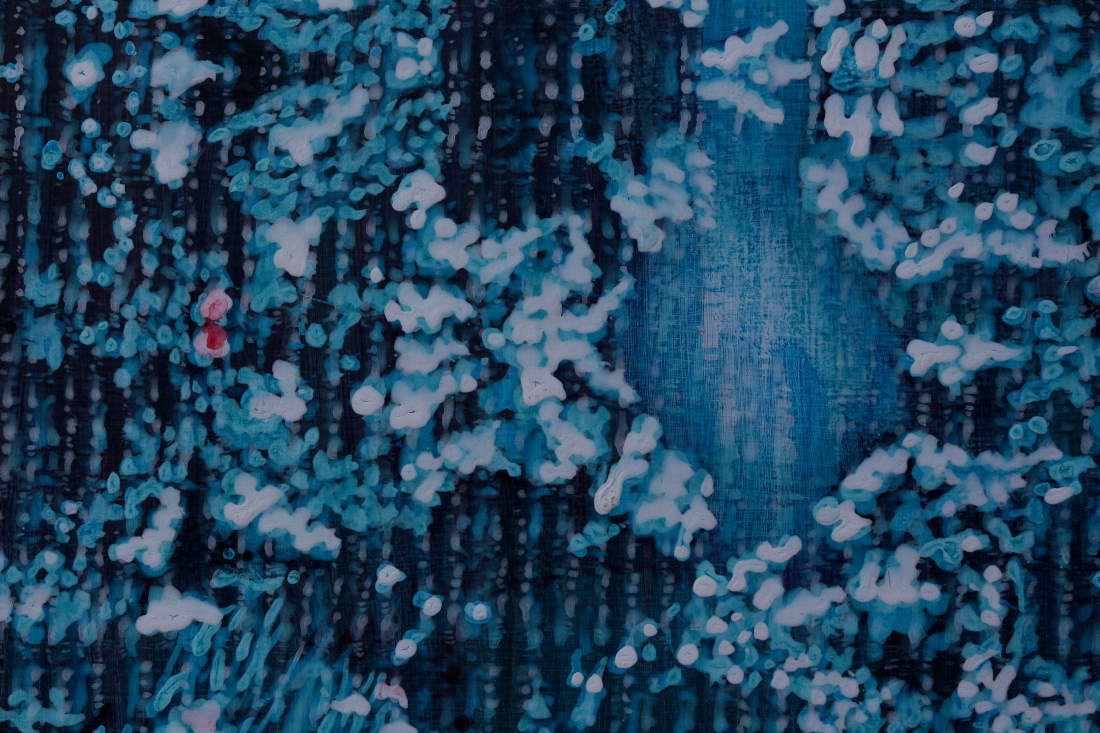 Intention, review, view again, repeat, find the pattern you did not intentionally consciously paint. Don’t be afraid! See what you see, see what have proared prepared for you to see. I see a horned god, with a red eye, he gestures as if teaching, instructing, he sits, reclines, at the bottom left, and weaves the disintegrated particles, reweaves, the particles have drifted far apart, disintegrated, they now coalesce in new-old patterns, there is no discernible pattern, there is no pattern that I can see, only the generality of leaves, and flowers, rain and water, reflections, liquid reflection, on the surface of the water, the coruscating light, mixing with the dark, mixed with the dark, inter-weaved with the dark. Who am I seducing? Who am I summoning? What earth encloses an conceals, and conceals, here you and I watch the formation, the determonation determination, the vague intuitions, as they rise toward the surface of the water, we look into the pool and you help me to judge the formations, that rise and the formations that sink, the aborted formations, that sink disintegrate, rot at the bottom, and their material is reused, recreated, as they are activated, sparked, made to move. Who does that, way down nelow below, in the depths of my subconscious? What trial do the proto-determinations need to endure before they rise into consciousness? What tests of strength? What validates them? Does their mere appearance validate them; the fact that they are worthy of appearance? Do I judge all appearances as good? An appearance indicates an intelligent an intelligent motivator, it depends on the motivator, who remains concealed, no eye shall see me, no man shall look upon me, and live. This technological image that mimics and seduces, that seems to refer to something ’real’, that you repeatedly paint and analyse, repeatedly, contemplate, we sit and look at the formations, the vague determonation determinations, and you help to discern, to judge, to recognise the horned god that appears in this film image, the motivator, and its fearful symmetry. Oh tiger! Is this the evil demon of imahes images? The horned god with the red eye is the assigned one to my pool, or to all images technological. The motivator behind technology, the driving force, the manipulating force within everyone who has drunk from the trough, assimilated modernisation, technologised nature, nature awkwardly stretched out into this technological image, this film imahe image, seducing by imitating my desires, my false desires, the prepared space, for the hook to catch on, for the seed to be planted, to grow and form, and rise into consciousness, determined.