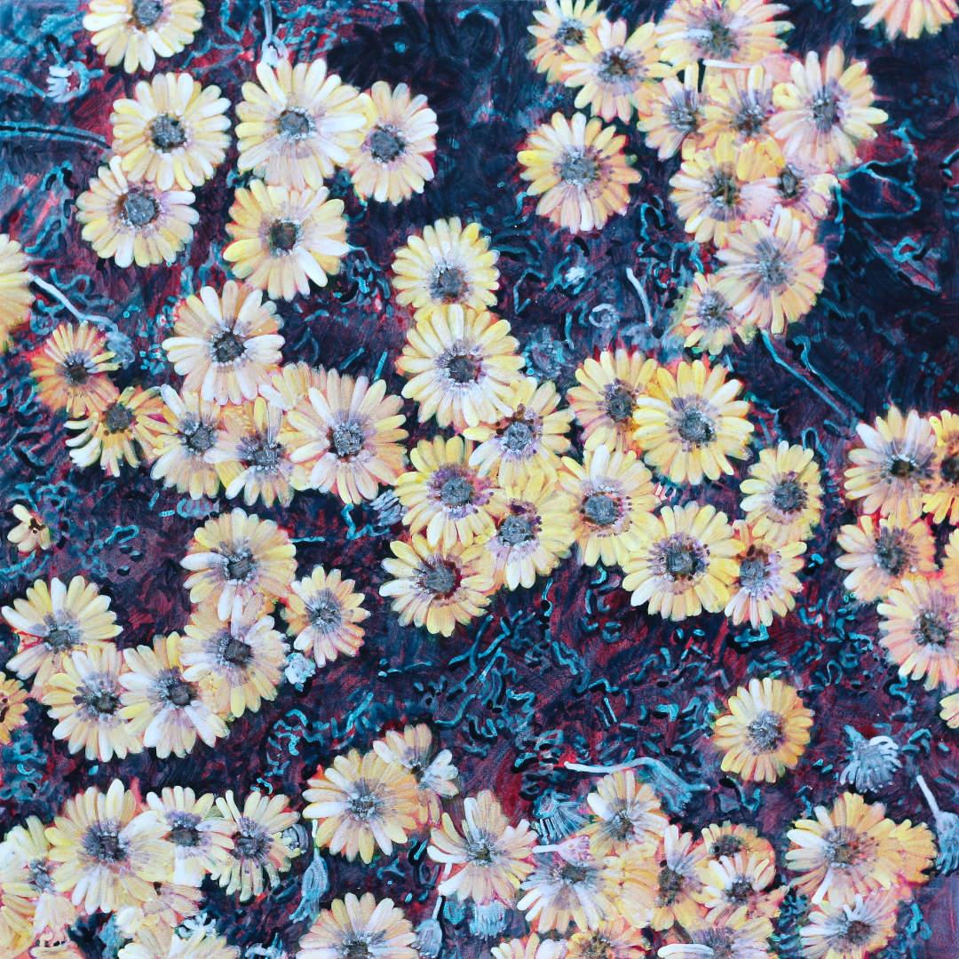 [9 August 2023] I count 77 flowers here. About 22 petals per flower. So that is 77x22=1694 petals. It seems like a fair price to charge for this painting. Flaming petals, on fire, blazing—fire in this one, as opposed to water. There's something apocalyptic about this one; renewal requires destruction. Renew, repeat, but better this time round. Vegetation often speaks of social systems to me. Complexity, fecundity, disorientation, too complex to understand, relinquishing control, relinquishing possession, beyond understanding, beyond control. If I repeat this image sixteen times, then I would have painted about 27 104 petals. Still not nearly complex enough to represent a social system. How do we administrate all these people? How do we control them? Who of us has ever consciously counted to 27 104? What are we trying to do, and why? Can you see the glowing lava below the volcanic soil from which these savage blooms are emerging? Flowers don't grow from fire; they need water. Can you see the abhorrent savage hell-blooms I see? Is this saying something about us or just me? Is this a self-portrait? I did not expect these flowers to be so dark. There is no rain in this one. Am I struggling to see past my conceptual framework? If these are not flowers, what are they? Ideas? Is this painting about anger? I see these savage ideas multiplying. Each idea has a dark center, radiating fire, feeding from a seemingly endless well of lava. Am I really that angry? Are you?