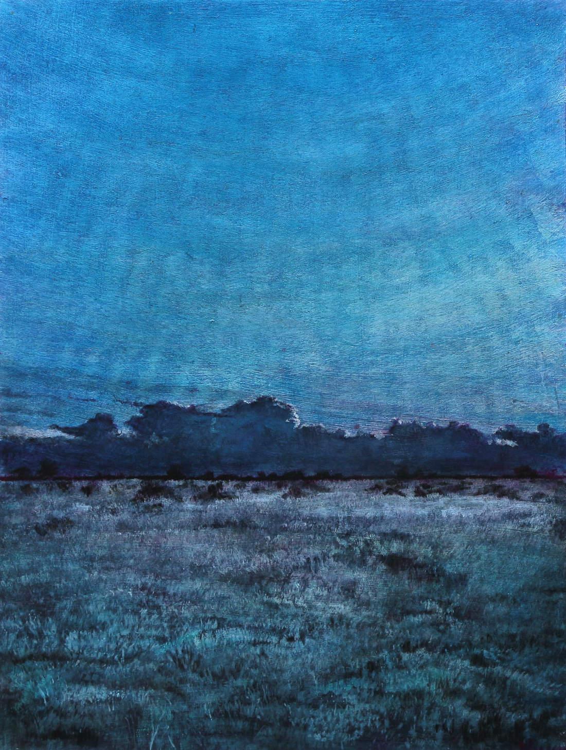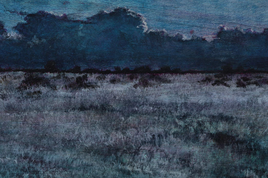 The vertical format of this landscape indicates a concern for the spiritual. The sacred journey from the grassy earth below to the high vaults of the sky are included here. A sacred journey is one of transformation and the rough terrain of the land, the border of black trees and the dark clouds on the horison speak of transformation that comes by trial and fire. These landscapes become a symbolic description and record of one's walk through life in this world, and of one's transformation.