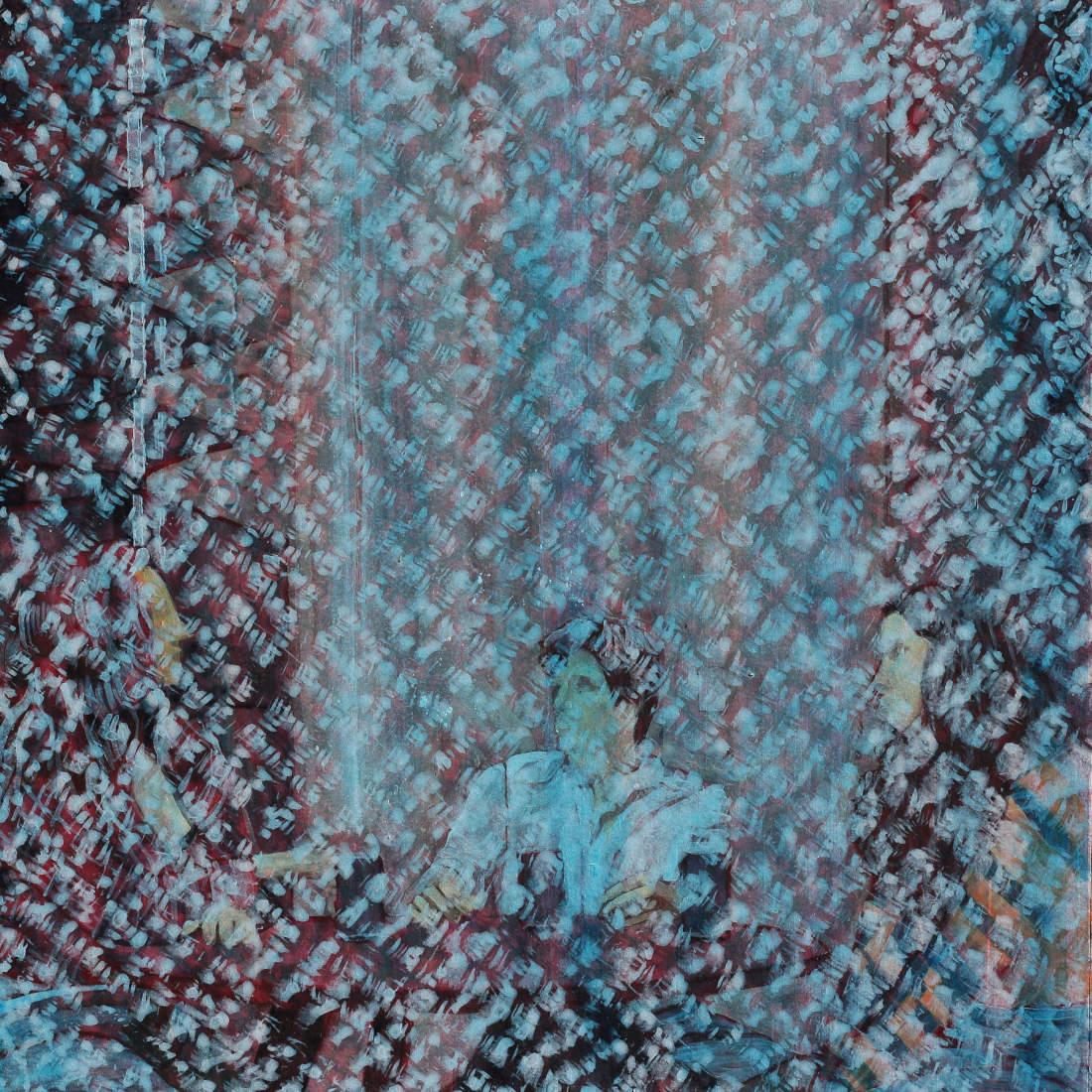 The man seems pure, surrounded by white and shafts of light. The woman on the right has a gentler pattern rising above her. The red woman is placed highest in the composition, the woman on the right second-highest, and the man sunk lowest. I suppose all these subtle placements send a subconscious message, revealing the real discussion taking place beneath the surface.