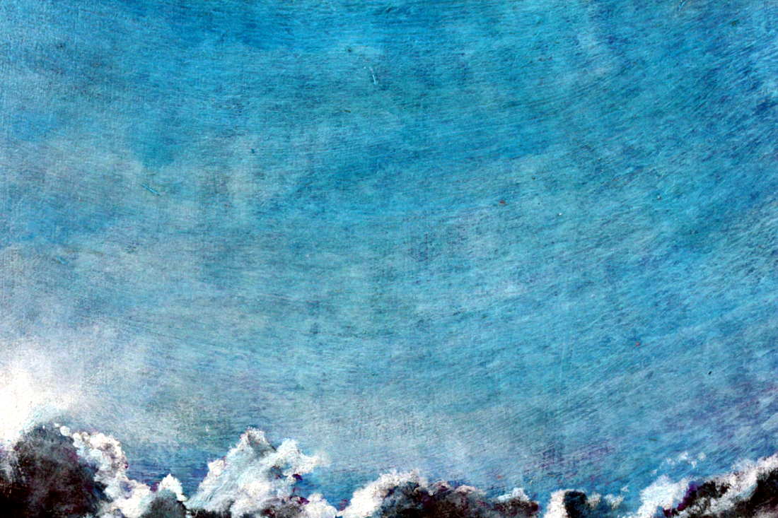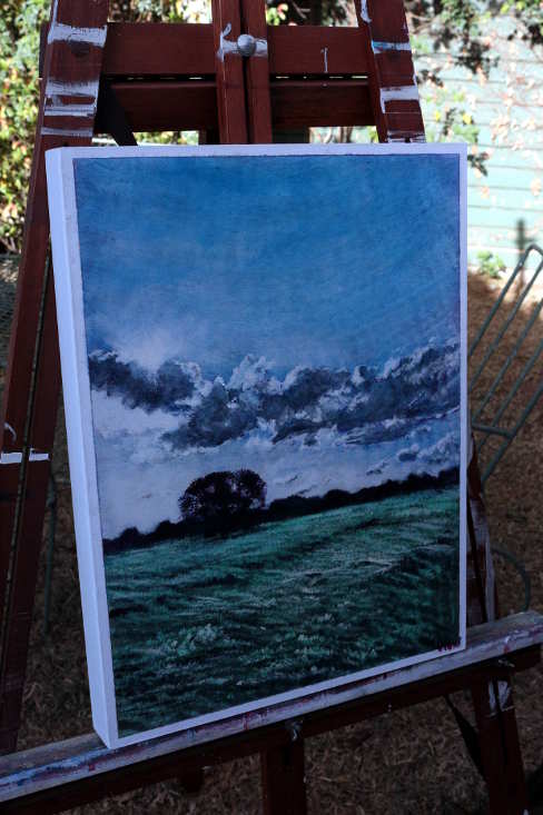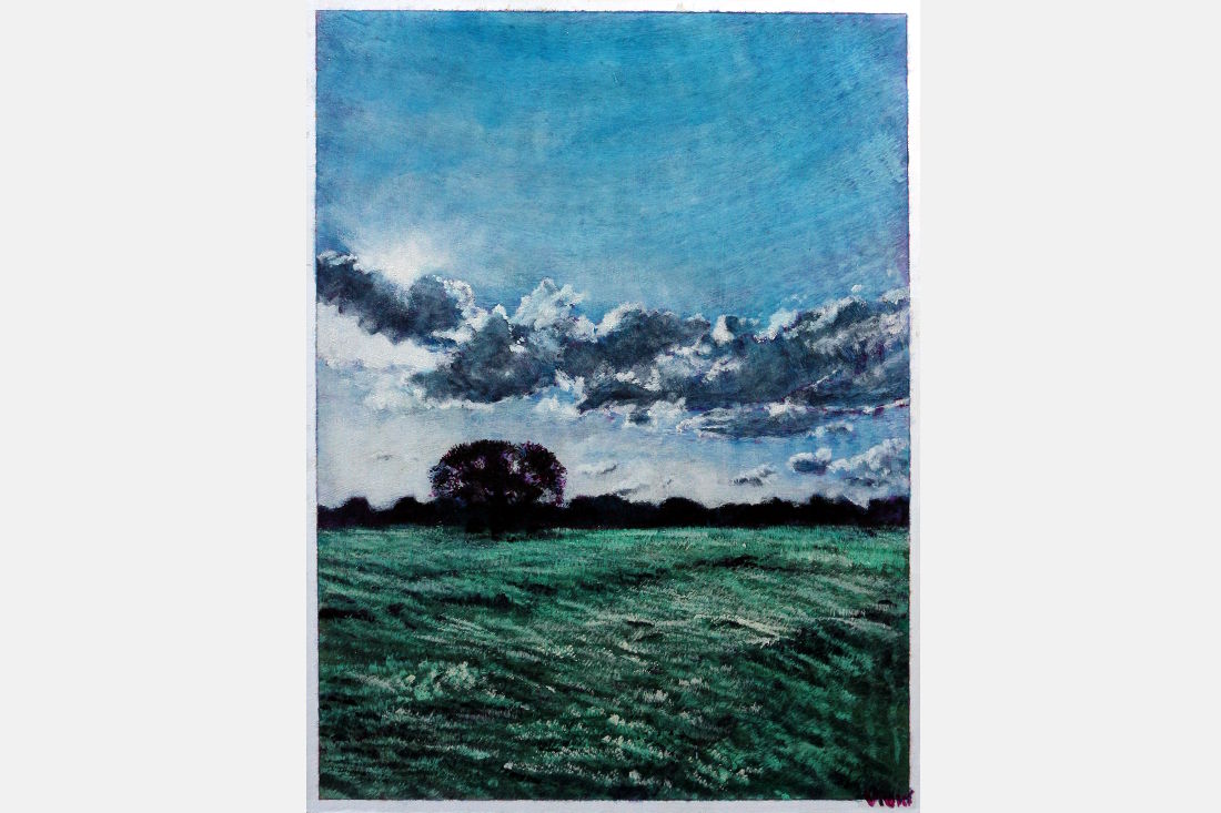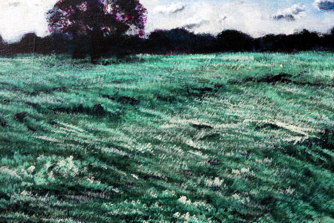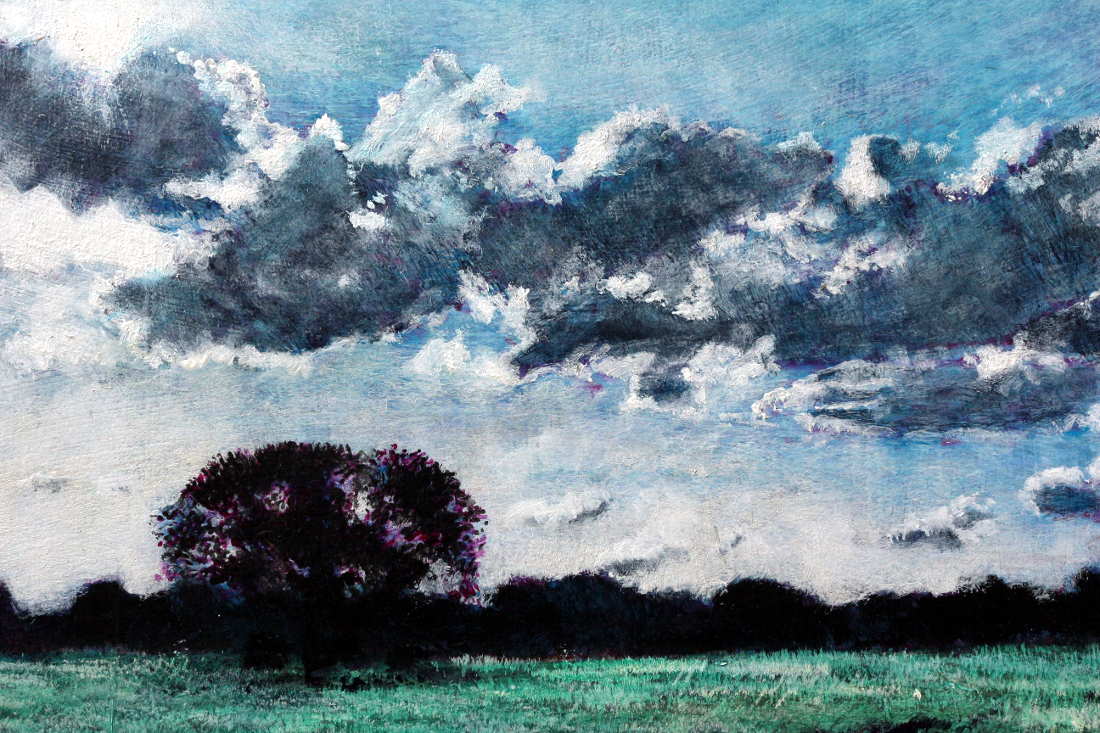 The elements that make up this idyllic landscape all have in them something that would seem to threaten to end the continuity of its harmony. The bright blue sky can transform into a terrible impersonal infinity. The light meandering clouds seem to have a dark side as they are blocking the sun and twisting in turmoil. The shady tree has an artificial electronic quality to it and sadly stands apart from the rest of the trees that form a dark band on the horizon. And, the lush green grass with flecks of gold cascading down from left to right ends suddenly in a cliff-like way before a yawning abyss. Everything seems less than perfect. There is a tension between the halcyon pastoral scene and that which threatens to end it. Any landscape is a condition of the spirit and reflects deeply who we are.