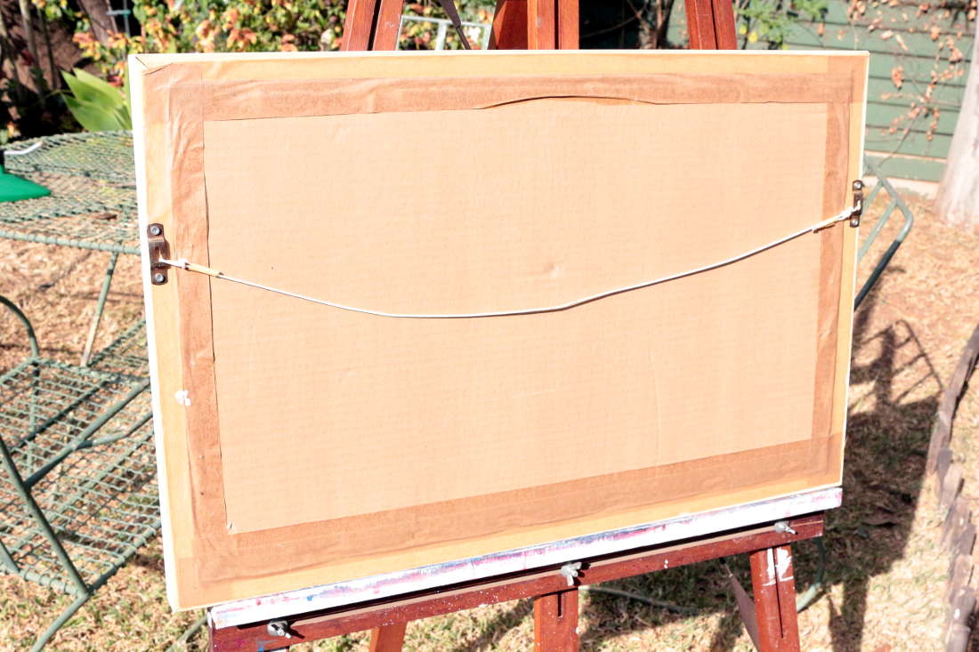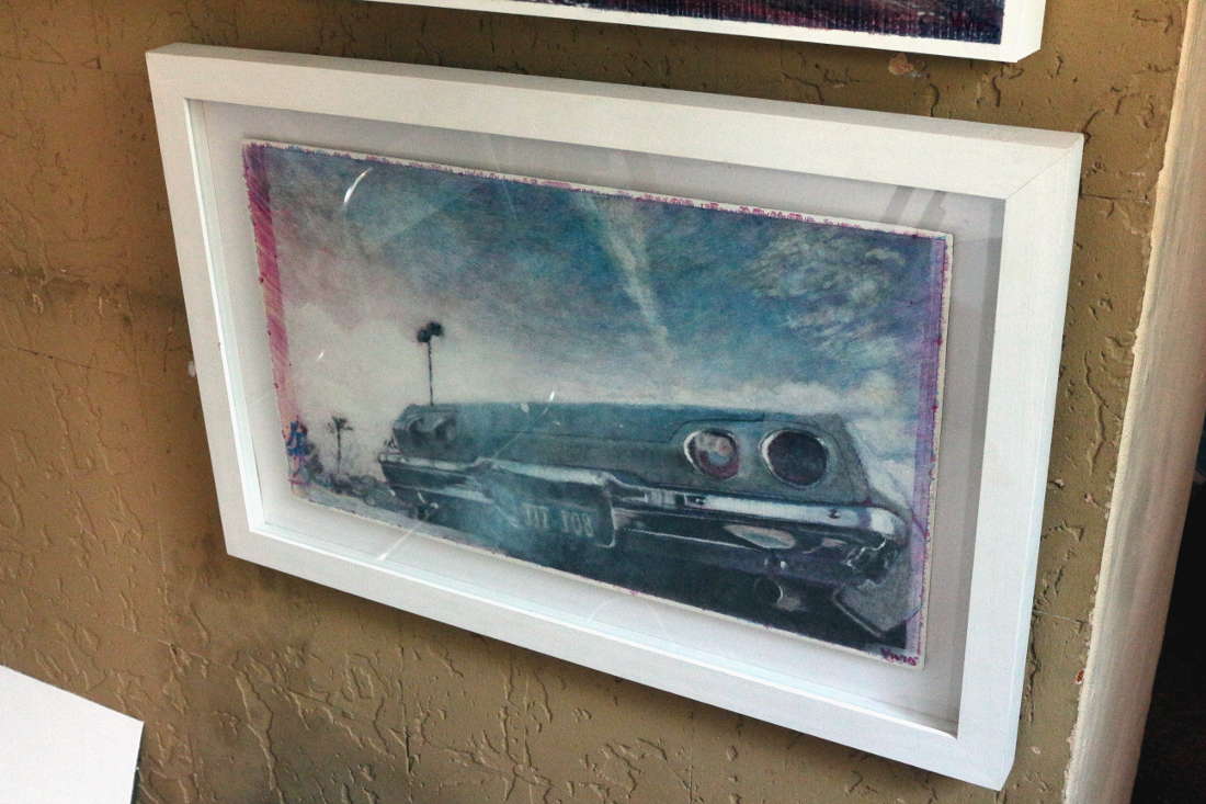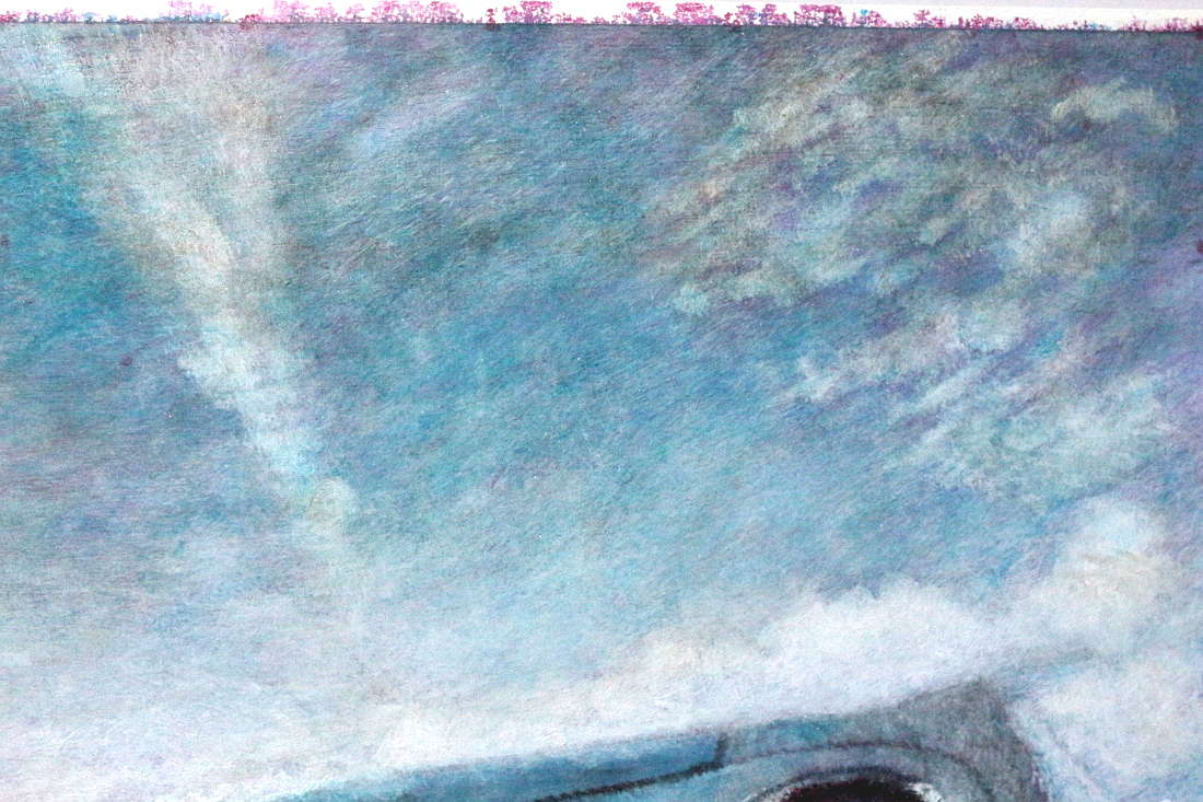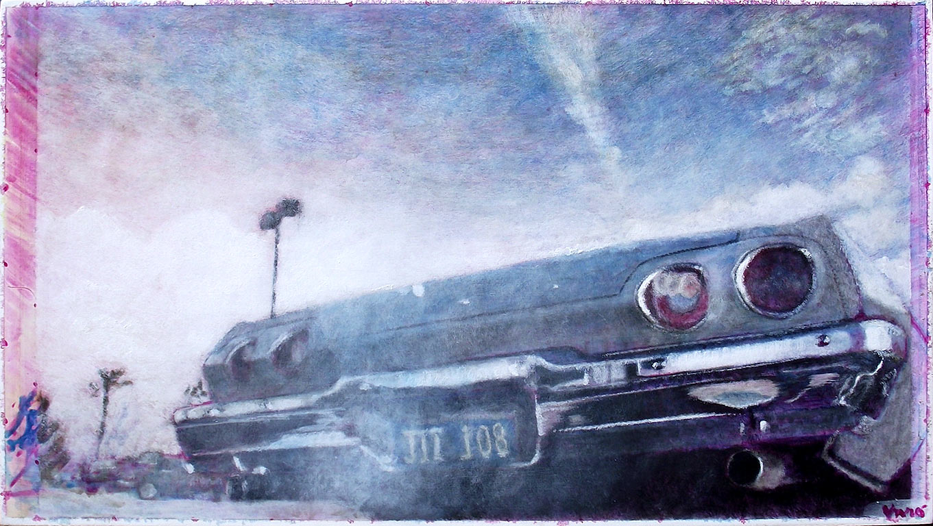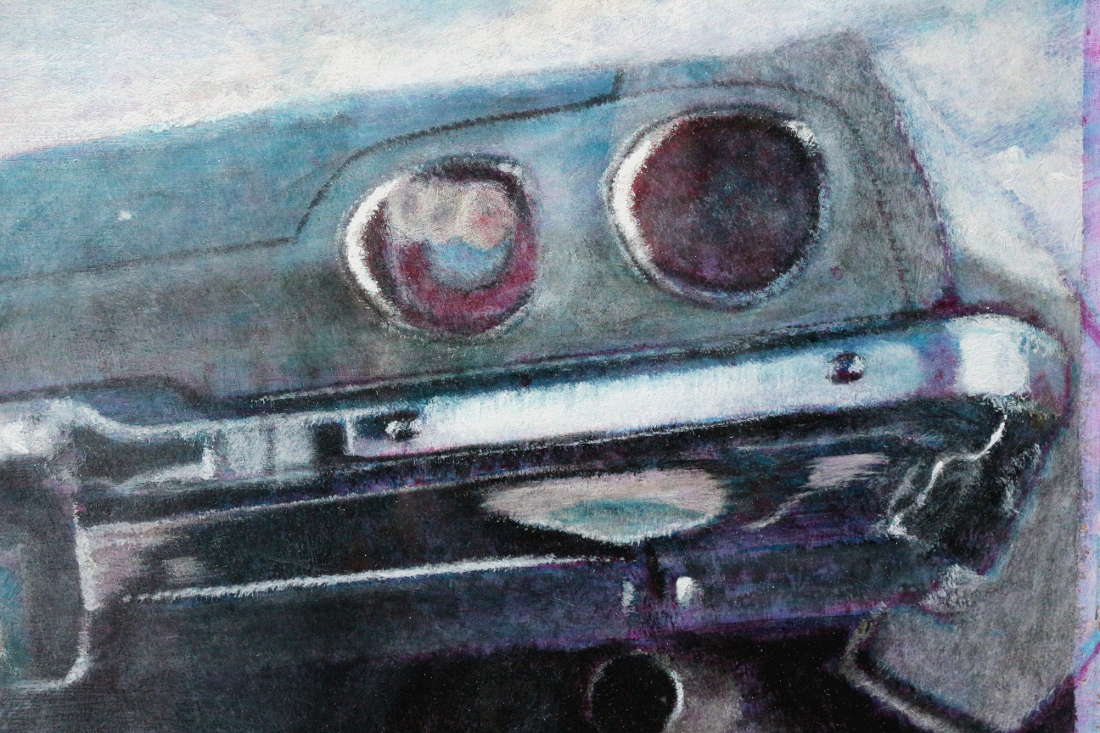 This epic painting is structured in time with the foreground depicting the present and the past receding into the background. The back of a car forms an imposing smug mechanical beast alluding to modernisation. It seems to want to breach the boundary of the painting’s surface and invade another world not fit for it. The number plate can be read as ’TIT JOB’, which suggests themes of self indulgence and hedonism, much like Hieronymus Bosch’s famous alter piece ’Garden of Earthly delights’ (1490-1510). The exhaust pipe expels a cloud of smoke and pollution creating a film of preconception which subtly transforms what we see into a false ’reality’. Towards the edges of the painting we begin to glimpse what lies behind this screen. At the bottom left, I see a maiden at a body of calm pure water, perhaps Beatrice in Paradise at the river Lethe in Dante’s Purgatorio (1320). The bleeds on the edges are like fractal blooms forming an unintelligible cipher, suggesting primal ideas, thoughts and solutions that are now perhaps lost to us.