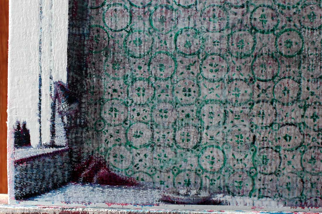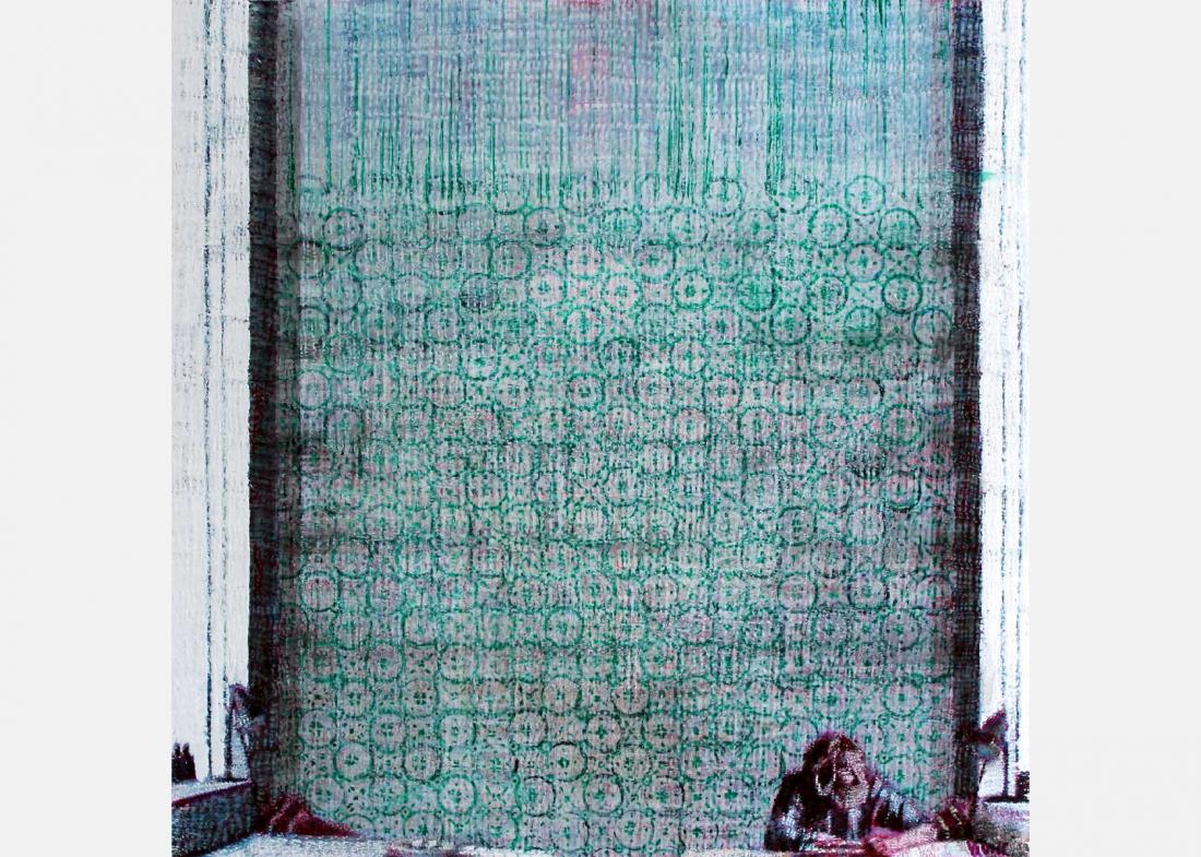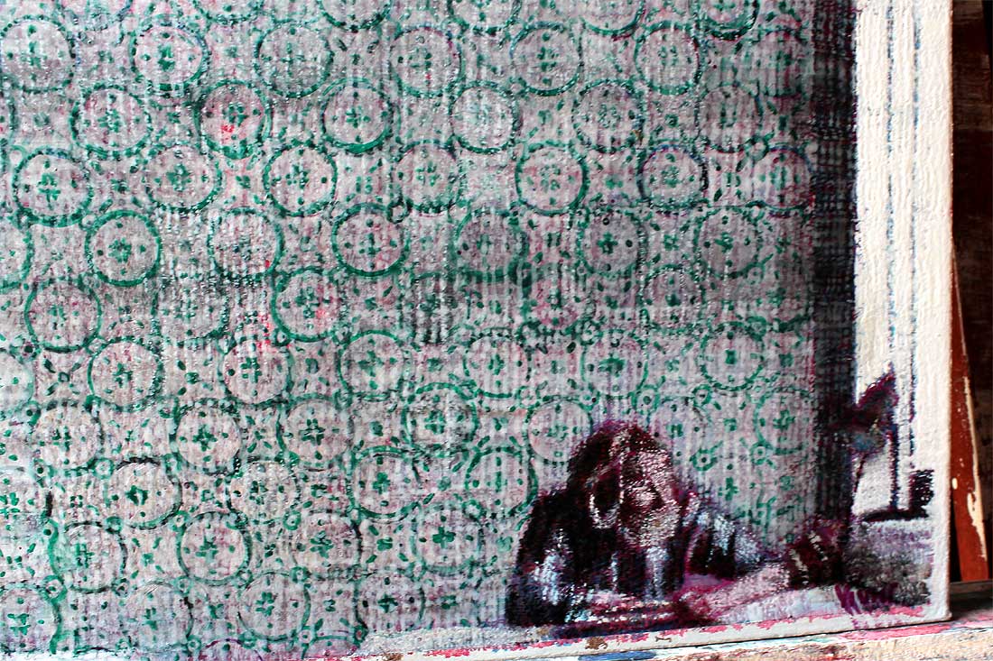 This work is inspired by TS Eliot’s poem, ’Gerontion’ (1920). As one of the lines from the poem suggest: the old man has been driven by the trades to a sleepy corner. Above him the winding, twisting web of his life is described in a two-dimensional pattern of repetitive circles and pixels. It is an ambiguous pattern in that one could interpret the pattern as describing a repetitive life of tedium and conformity, or it could be a pattern alluding to something more significant, perhaps divine form. Two bright white pillars of light framing the scene on either side, would perhaps reinforce the latter meaning . The old man seems alone and crushed, but not destroyed.