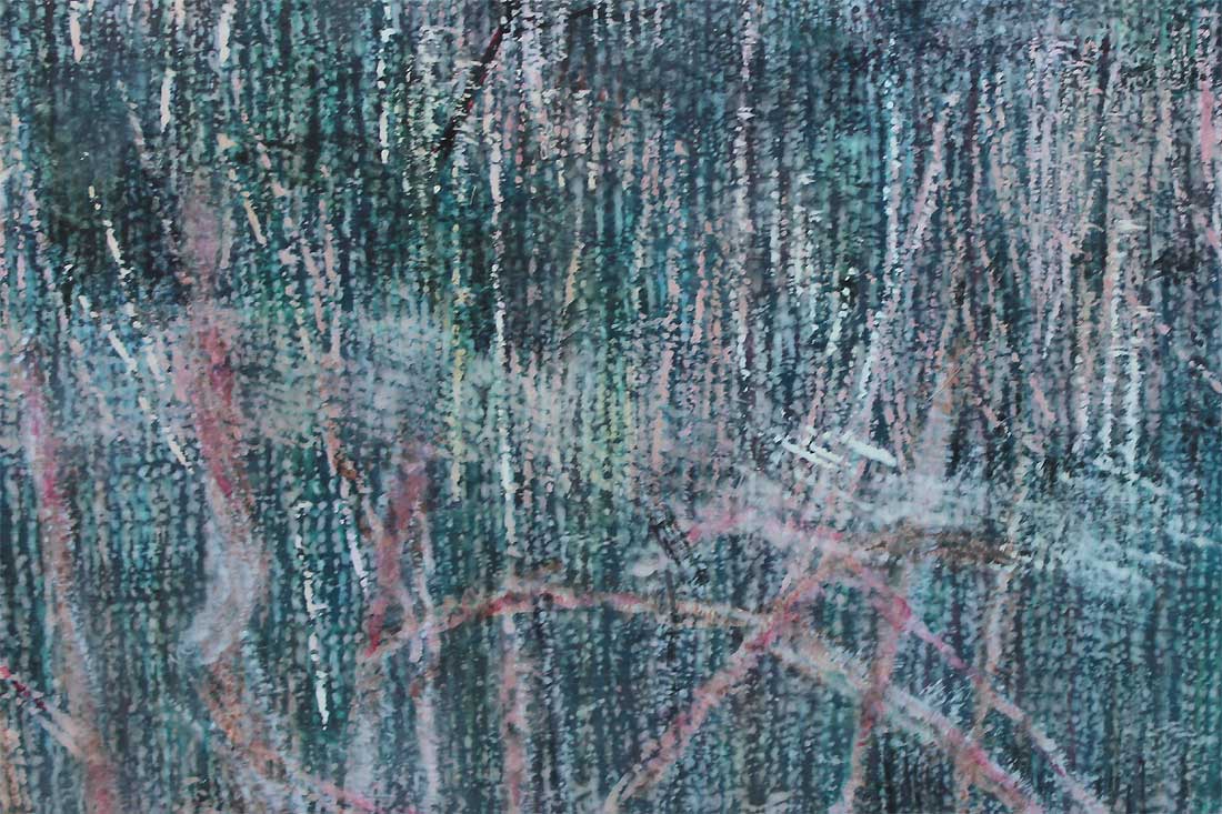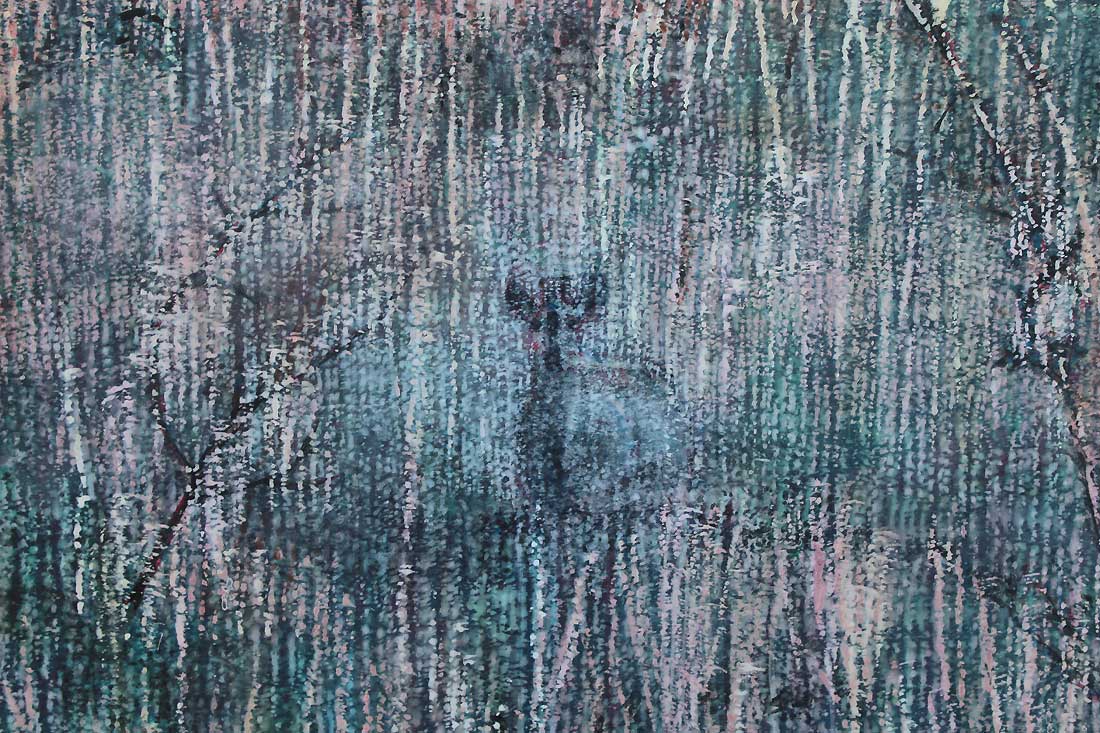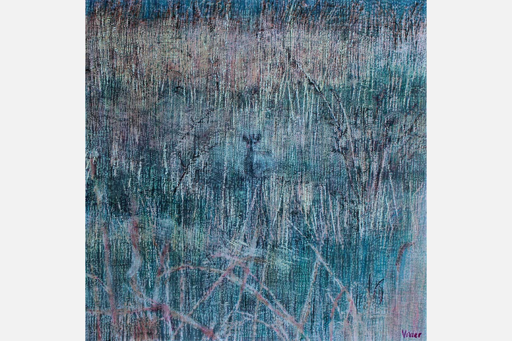 I find the duiker (a small antelope native to Sub-Saharan Africa) to be a local icon of innocence, meekness and mystery. Included in the painting we see its natural environment in an idyllic glade of grass and shrubbery. However, the duiker seems somewhat overwhelmed by its surroundings, which has been interpreted with a certain hyperreal quality, suggesting artificial powers greater than the meek duiker at play. This is emphasised by the almost completely hidden sapling to the left and a towering tuft of grass to the right which ominously frames the duiker within these subversive, hidden and powerful forces that may be threatening to its well-being, and creating a sense of jeopardy in this otherwise harmonious scene of ’untouched’ nature. Yet, the noble duiker endures, in spite of its seeming disadvantages, and in that I see beauty.