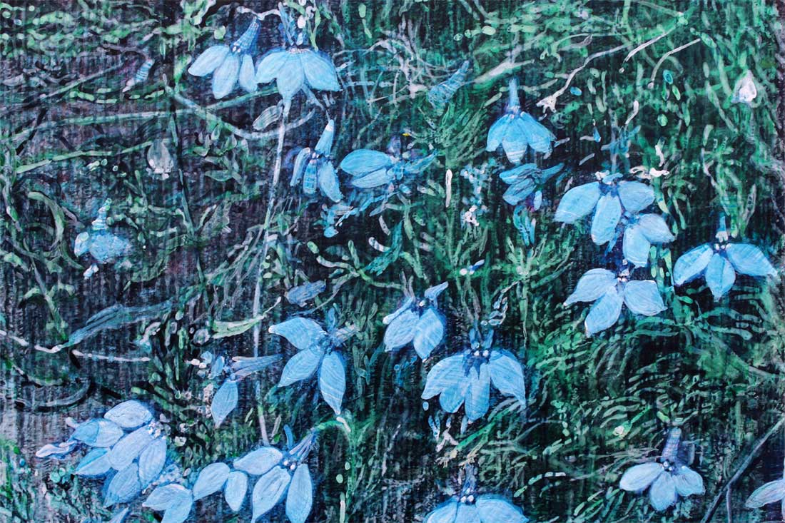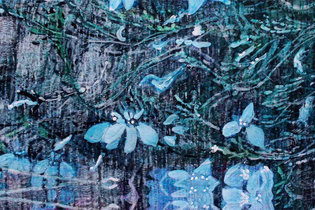 On an early spring day I noticed these flowers in my mother’s garden and saw something in them. I don’t know what exactly. I fetched my camera, took a photo and started to paint it. As I spent more time with this image new patterns and narratives emerged. I noticed that the flowers were quite moth-like or elfish, with wings and a pair of glowing aggressive eyes. They seemed quite mischievous and hypnotic too. They seemed to be slowly drifting downwards towards the bottom frame, where there is a strange disruption of simulacra that could be interpreted as a pool of water, or perhaps as a glimpse of what lies beyond the frame.