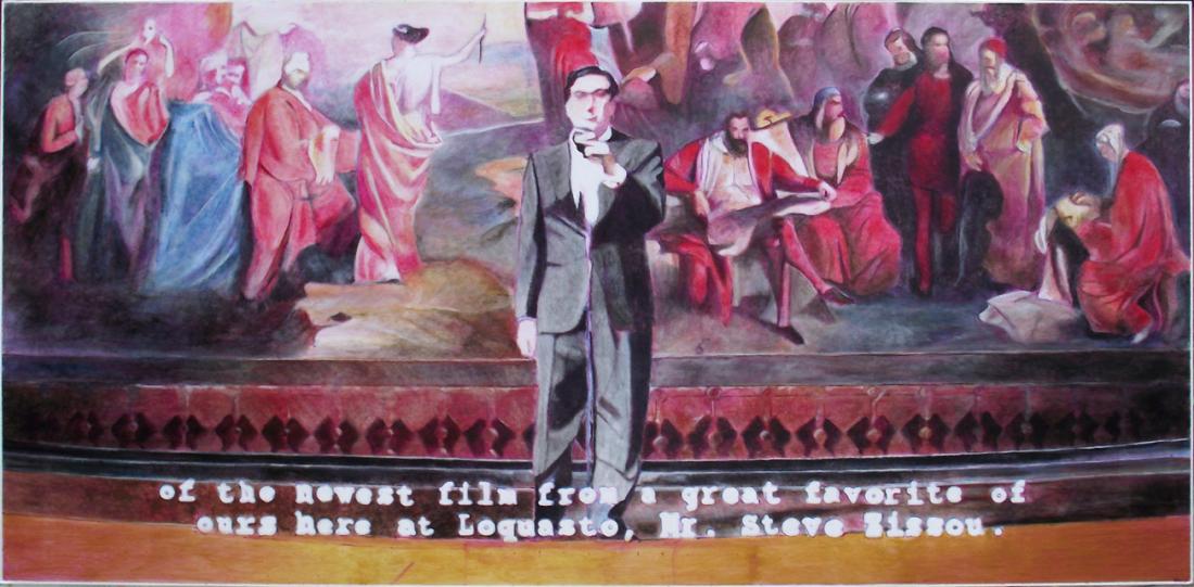 An introductory piece to the 'Out of the life aquatic' body of work, this piece is in broad strokes a brief history of modernity. The background references the beginnings of modern thought. In the middle a male individual in modern attire introduces a film within a film, referencing modernism at its height in the 20th century. On the surface and acknowledging the electronic screen, is a phrase of subtitles, referencing the postmodern present.